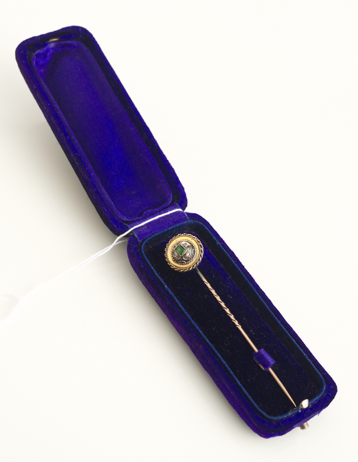 AN EMERALD SET PIN IN LOW CARAT GOLD, BOXED, 2.1GMS