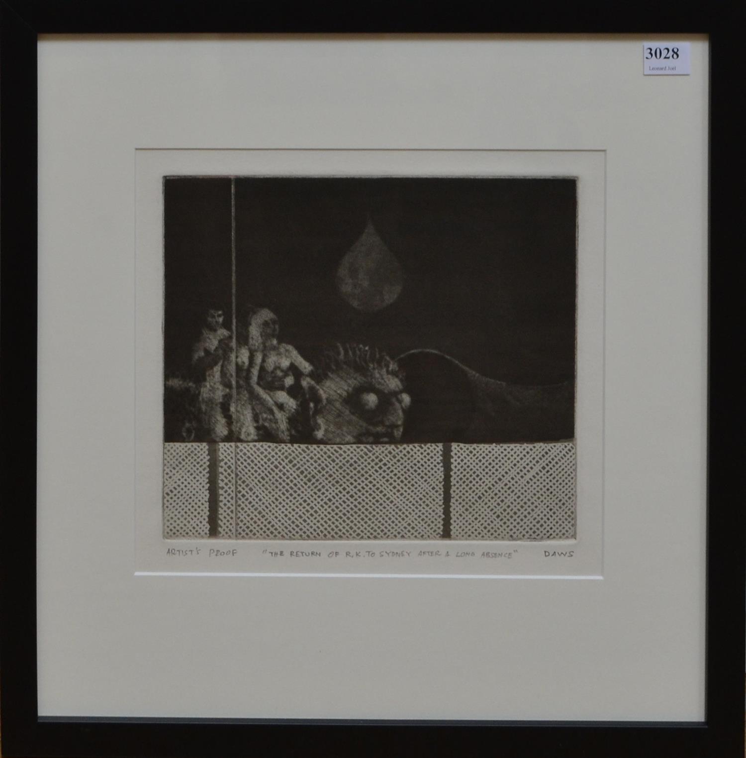 LAWRENCE DAWS, THE RETURN OF R.K. TO SYDNEY AFTER A LONG ABSENCE, ETCHING AND AQUATINT, SIGNED UNDER IMAGE, 20 X 22.5CM, FRAME SIZE: 42 X 42CM, LEONARD JOEL DELIVERY SIZE: SMALL