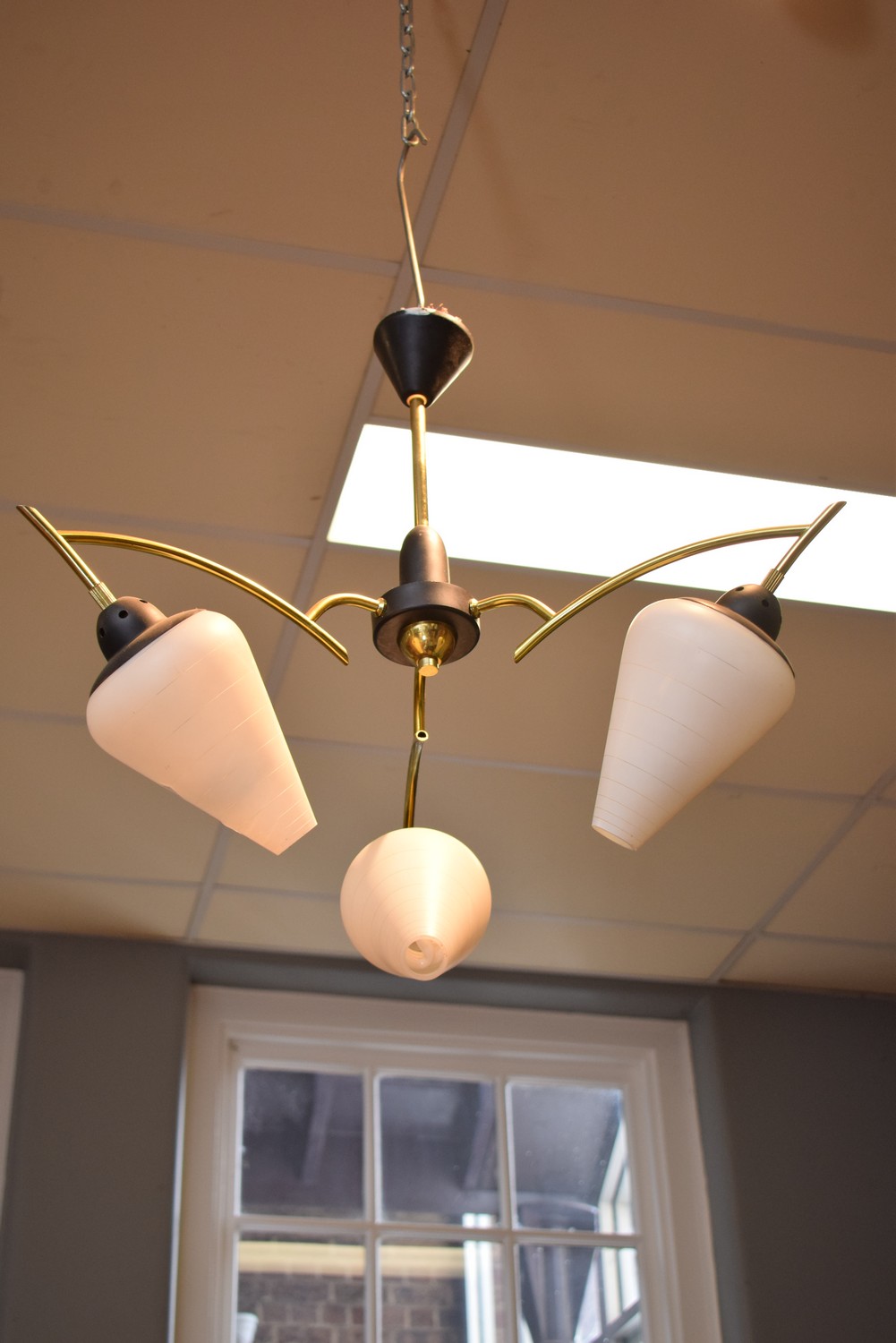 A 1950S THREE BRANCH CHANDELIER WITH GLASS SHADES (LEONARD JOEL DELIVERY SIZE: MEDIUM)