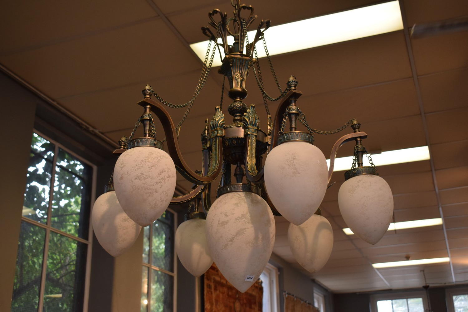 A CLASSIC ITALIAN BRASS EFFECT SEVEN GLOBE CHANDELIER WITH BELL PENDANTS (80H x 80D CM) (PLEASE NOTE THIS HEAVY ITEM MUST BE REMOVED BY CARRIERS AT THE CUSTOMER'S EXPENSE)