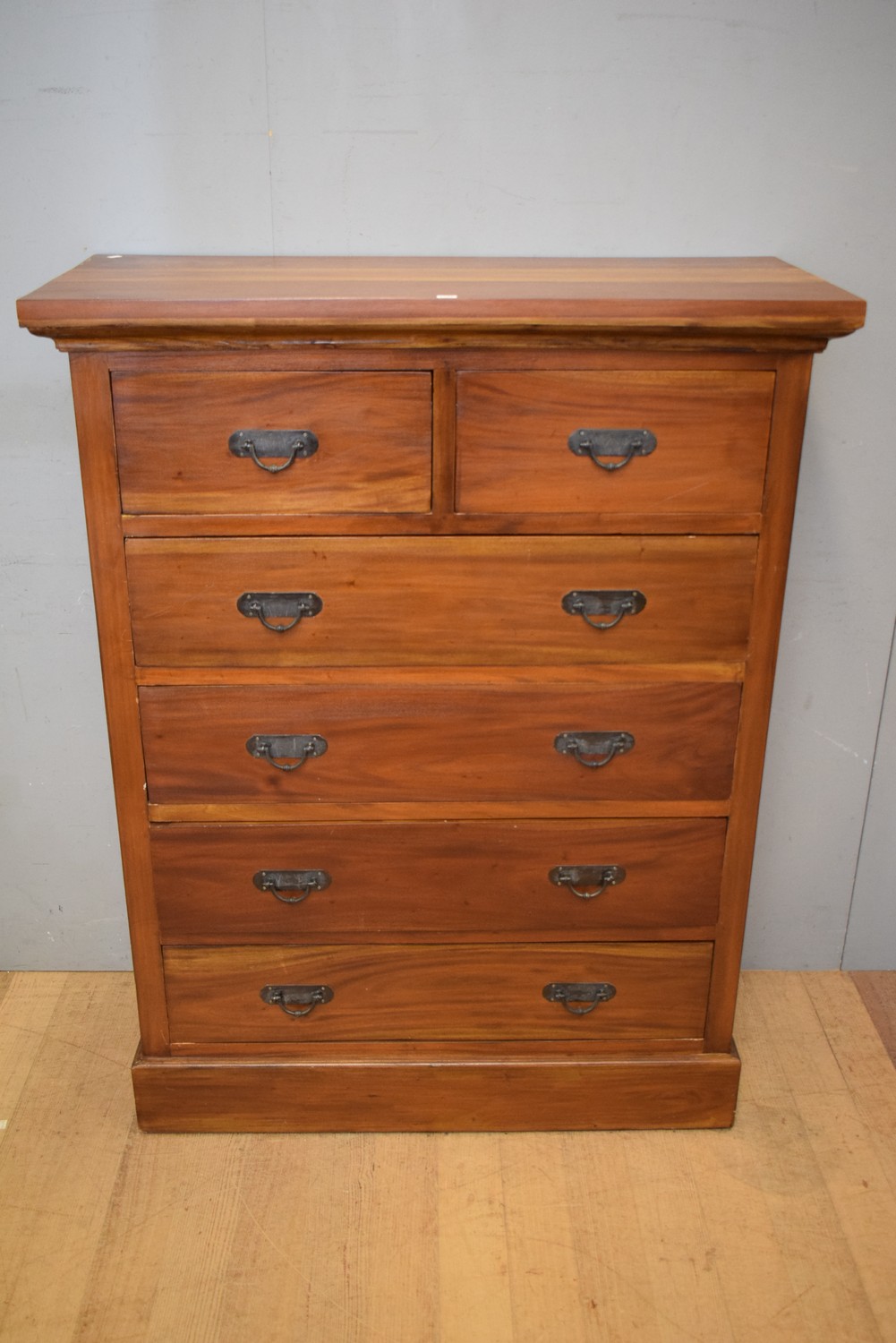 A TEAK SIX DRAWER CHEST OF DRAWERS (141H x 110W x 48D CM) (PLEASE NOTE THIS HEAVY ITEM MUST BE REMOVED BY CARRIERS AT THE CUSTOMER'S EXPENSE. LEONARD JOEL STAFF CANNOT ASSIST CARRYING THIS ITEM) (X-LARGE ITEM)