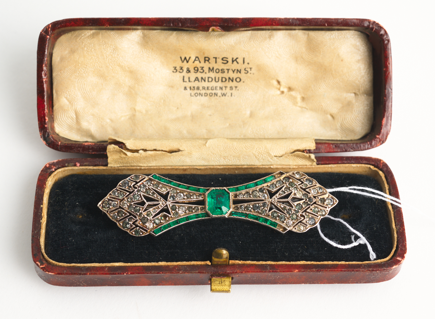 AN ART DECO STYLE EMERALD PASTE SET BROOCH IN SILVER, MADE IN FRANCE, BOXED
