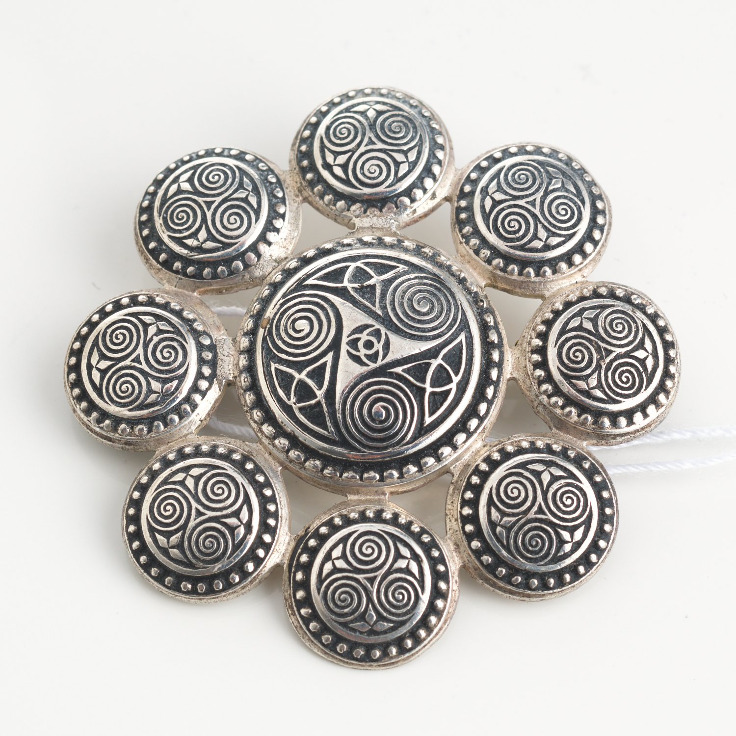 A CELTIC STYLE BROOCH IN SILVER, 5CM DIAMETER