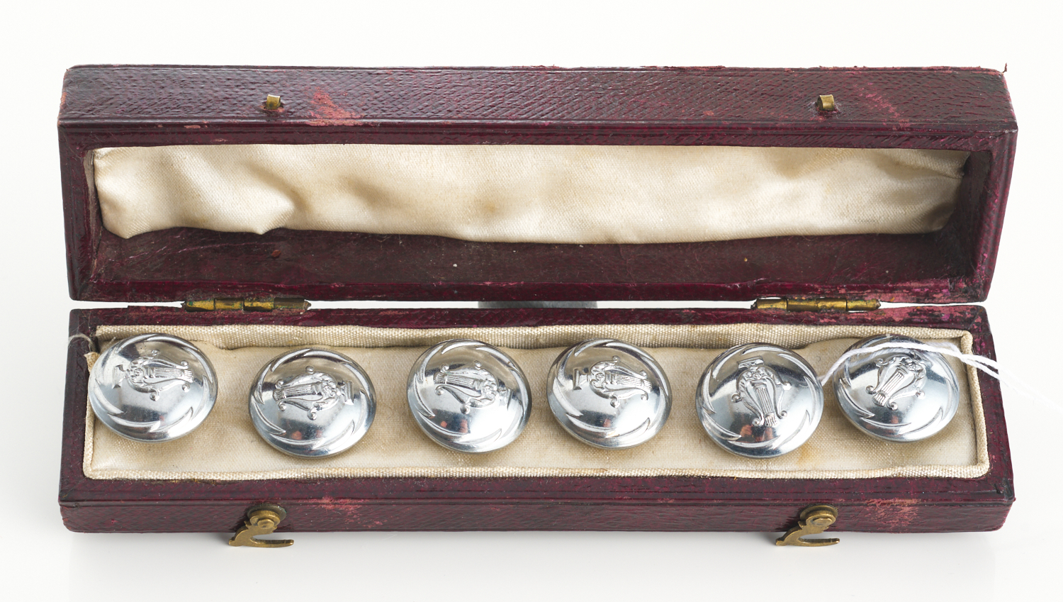 A SET OF SIX BUTTONS IN SILVER PLATED METAL, BOXED