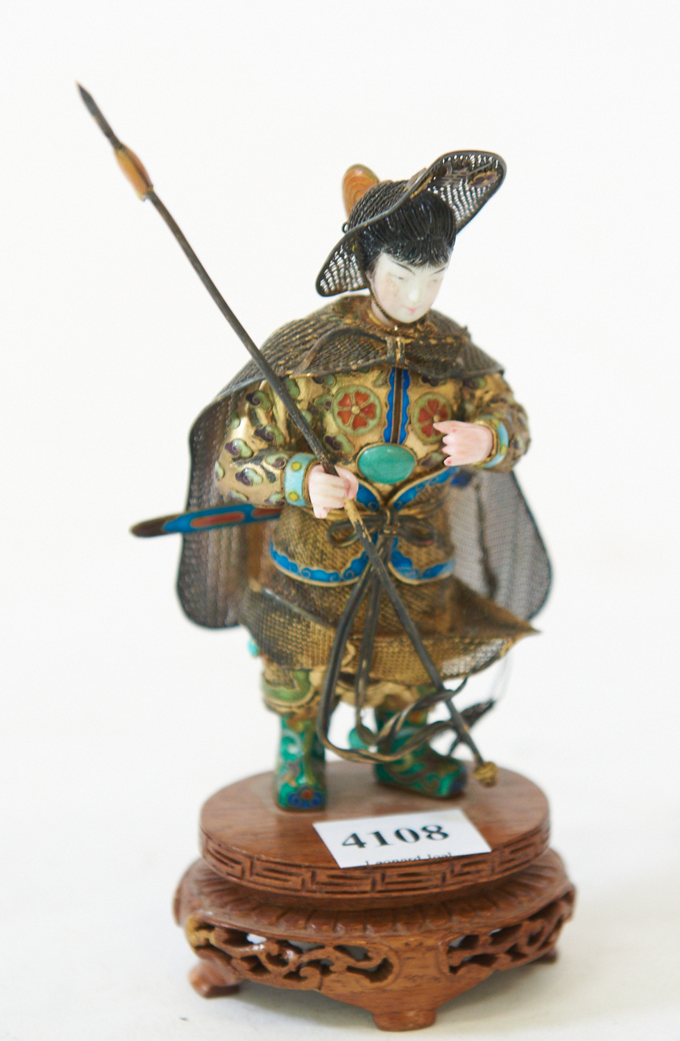 A CHINESE ENAMEL SILVER FIGURE OF WARRIOR ON WOODEN STAND (14 CM H), LEONARD JOEL LOCAL DELIVERY SIZE: SMALL