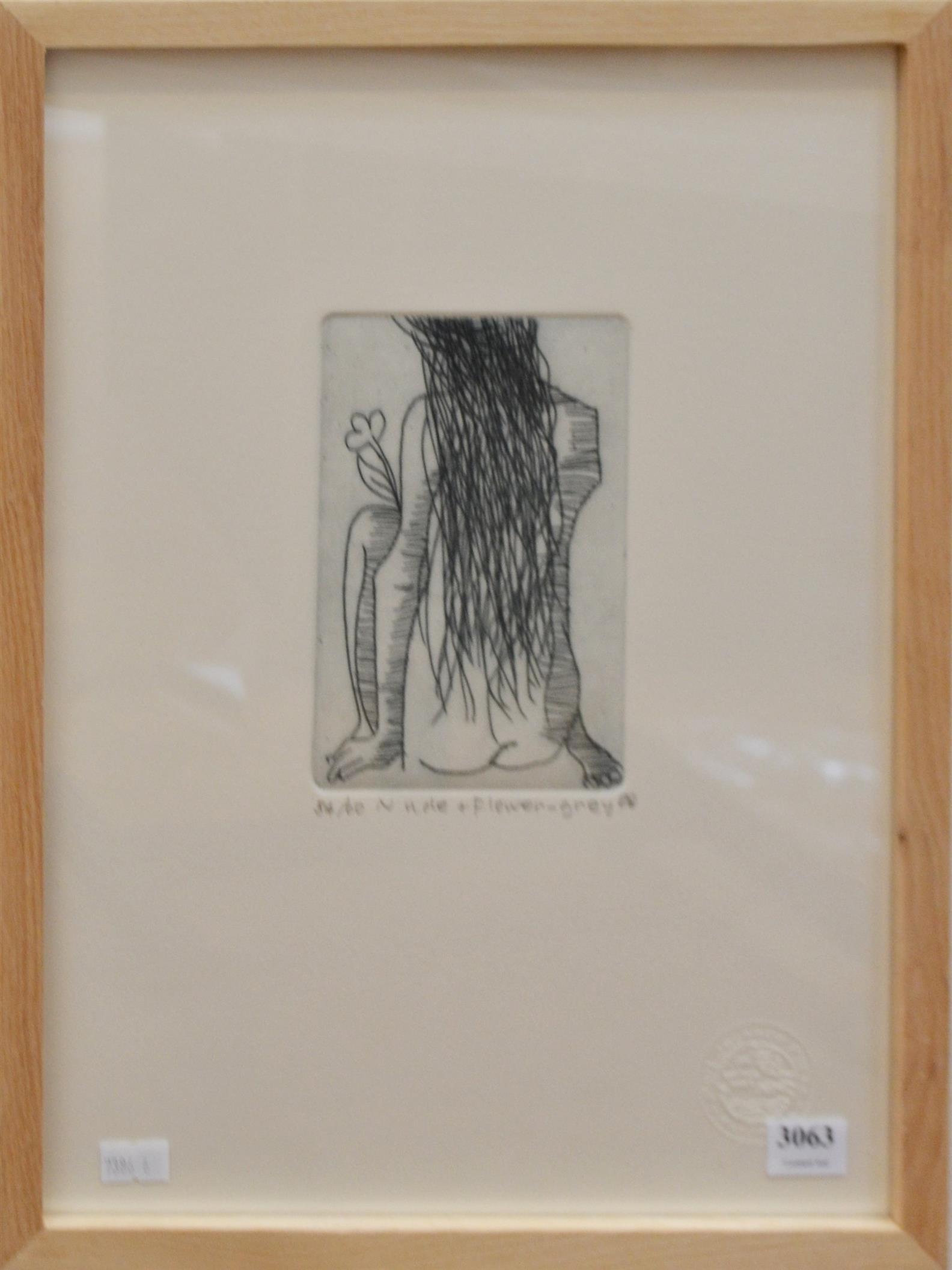 CHARLES BLACKMAN, NUDE + FLOWER - GREY, ETCHING 54/60, 15 X 10CM, LEONARD JOEL DELIVERY SIZE: SMALL