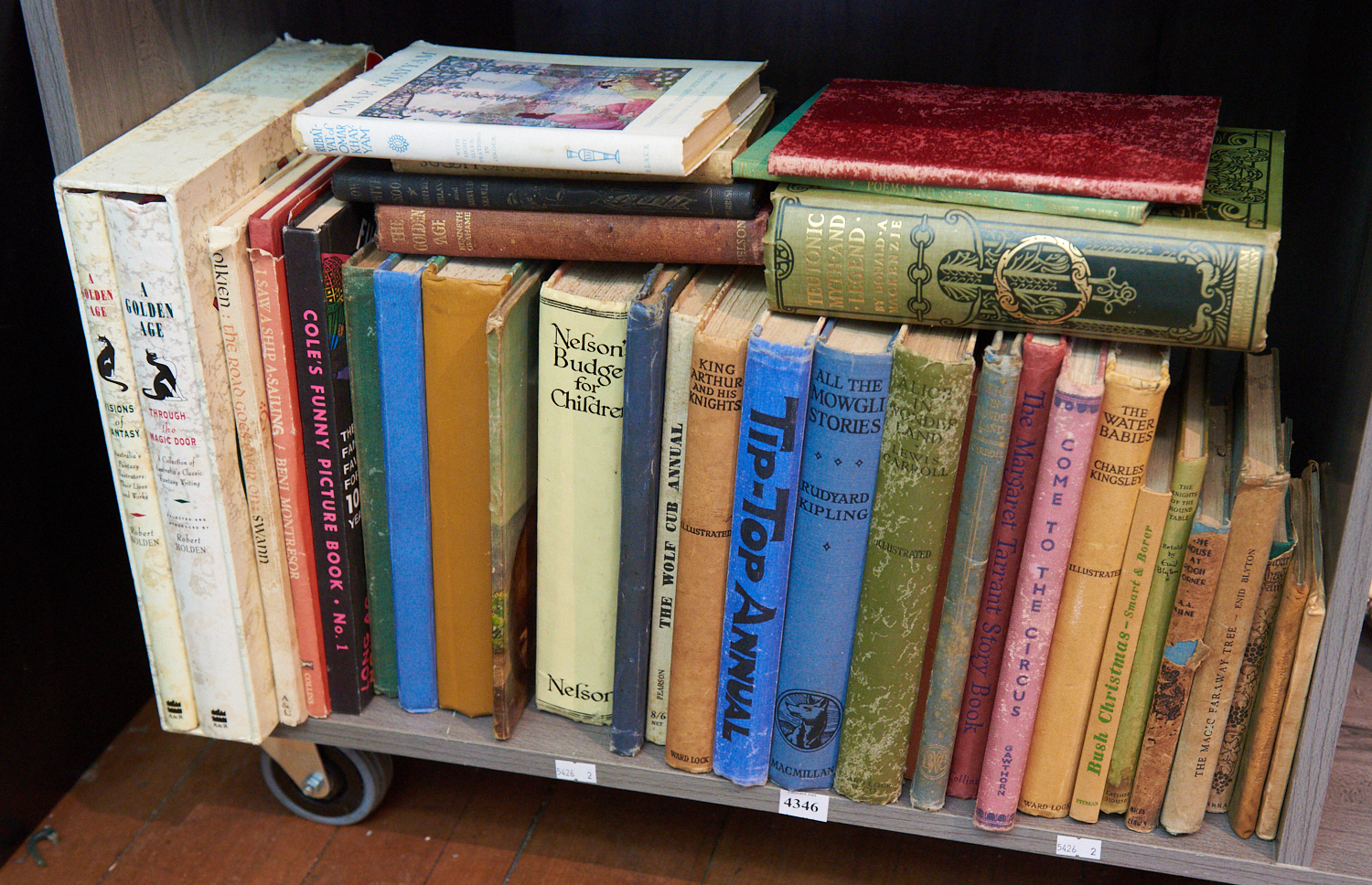 A SHELF OF VINTAGE CHILDREN'S BOOKS , INC. ENID BLYTON, MARGARET TARRANT, LEWIS CARROLL, OMAR KHAYYAM, LEONARD JOEL LOCAL DELIVERY SIZE: SMALL