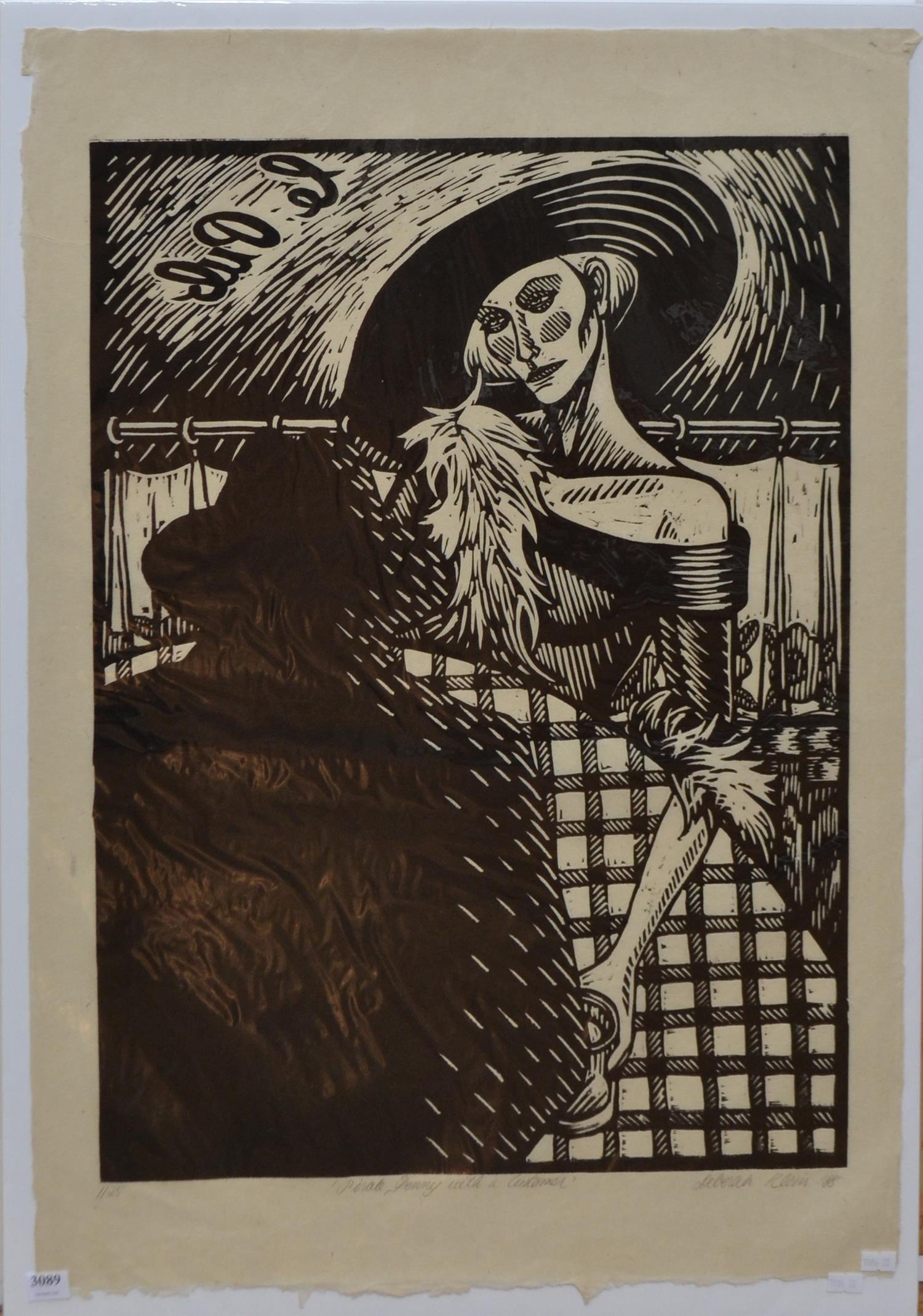 DEBORAH KLEIN, PIRATE JENNY WITH A CUSTOMER 1988, LINOCUT 1/25, 61 X 46CM, UNFRAMED BUT BACKED AND WRAPPED FOR PROTECTION, LEONARD JOEL DELIVERY SIZE: SMALL