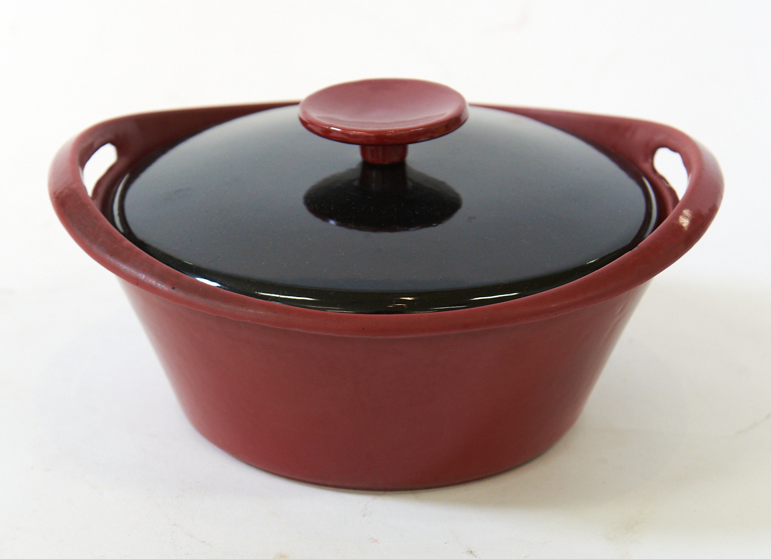 A MID-CENTURY CAST IRON RED AND BLACK ENAMEL CASSEROLE (26 CM D), LEONARD JOEL LOCAL DELIVERY SIZE: SMALL