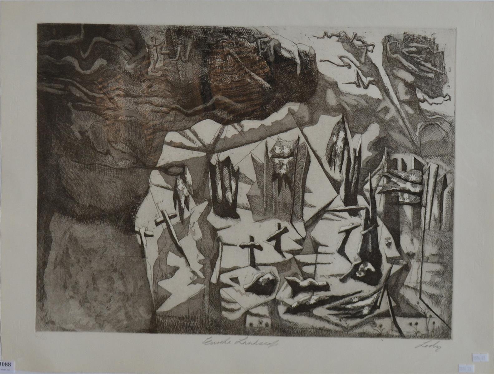 KEITH LOOBY, EUREKA LANDSCAPE, ETCHING 40/50, 35 X 59CM, UNFRAMED BUT BACKED AND WRAPPED FOR PROTECTION, LEONARD JOEL DELIVERY SIZE: SMALL