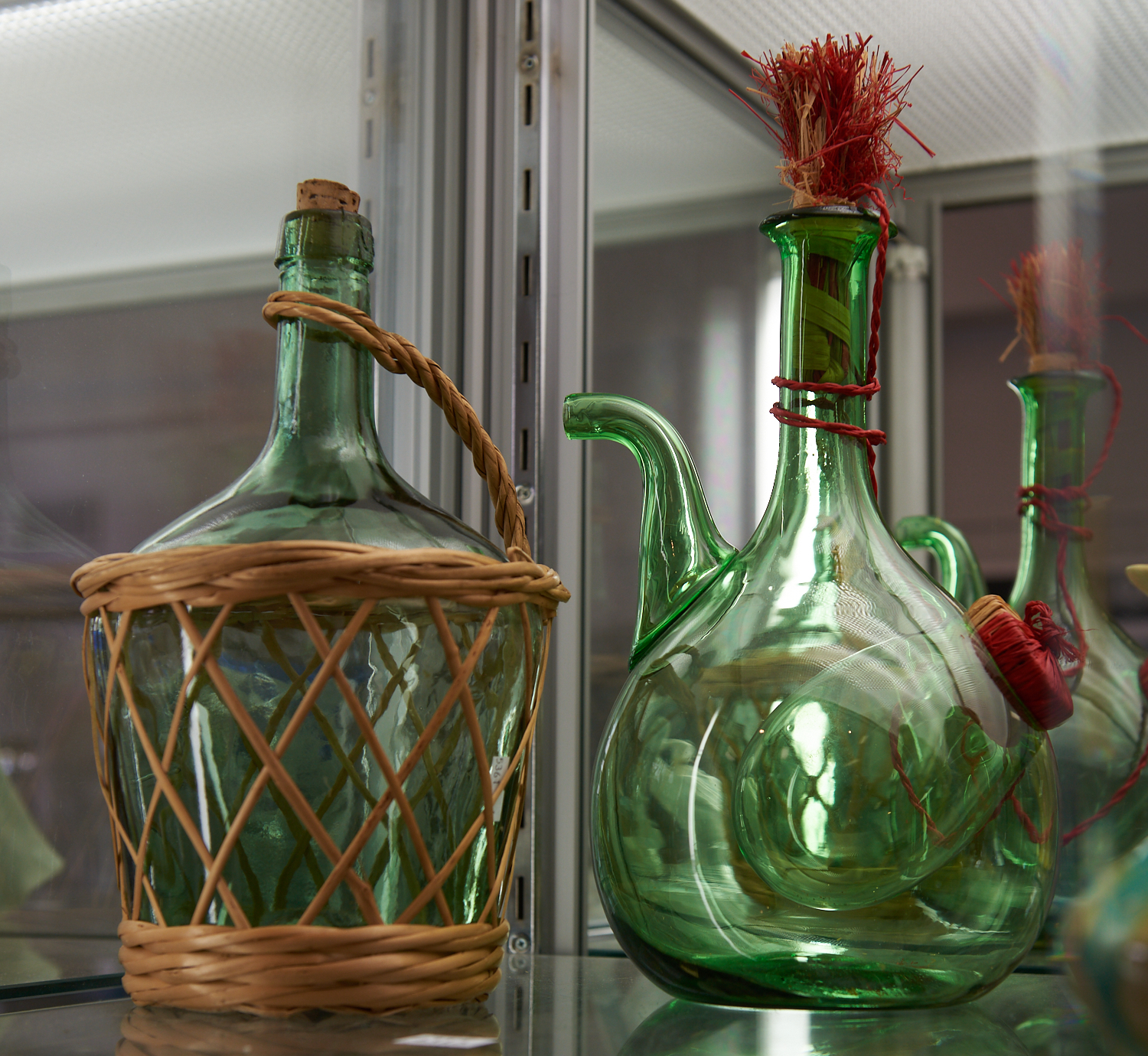 A FRENCH VINTAGE VIERSA BOTTLE IN A WICKER BASKET AND AN ITALIAN HAND-BLOWN EMPOLI VERDE WINE DECANTER (36 CM H), LEONARD JOEL LOCAL DELIVERY SIZE: SMALL