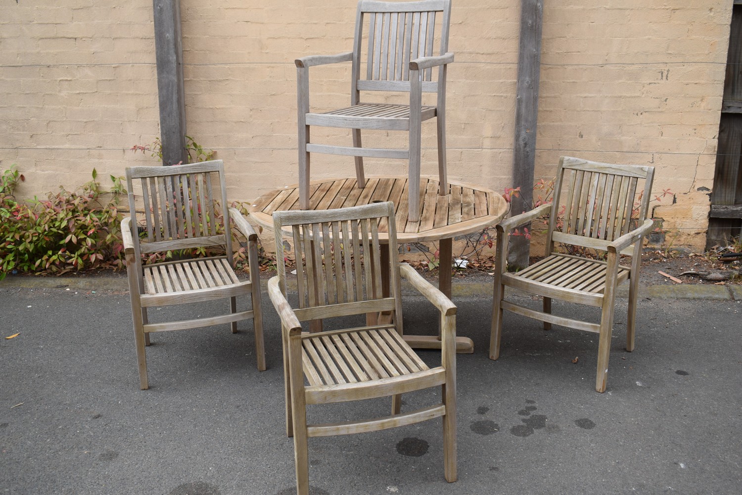 A FIVE PIECE TEAK OUTDOOR SETTING (75H x 120D CM) (PLEASE NOTE THIS HEAVY ITEM MUST BE REMOVED BY CARRIERS AT THE CUSTOMER'S EXPENSE. LEONARD JOEL STAFF CANNOT ASSIST CARRYING THIS ITEM) (X-LARGE ITEM)