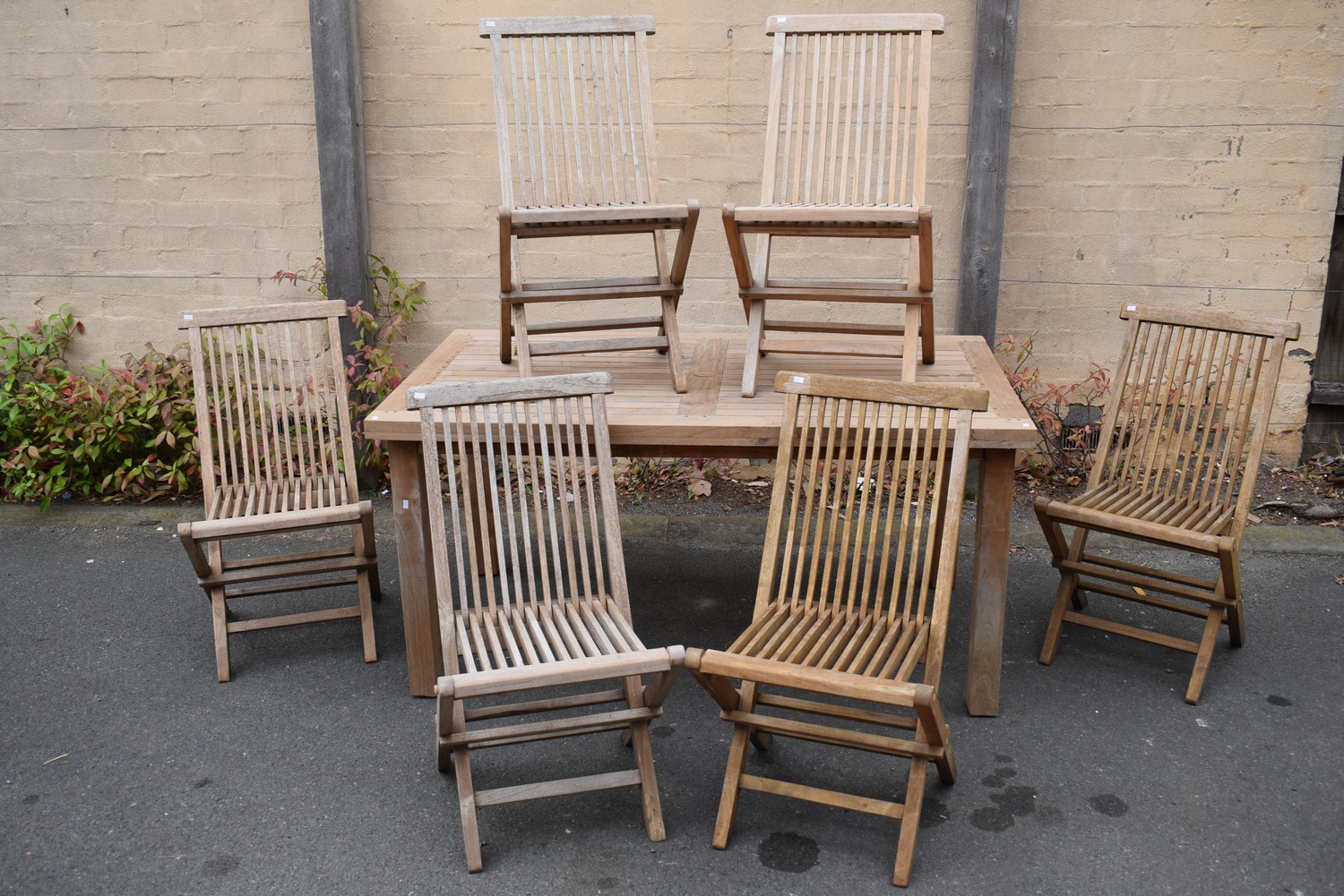A SEVEN PIECE TEAK OUTDOOR SETTING (76H x 155W x 90D CM) (PLEASE NOTE THIS HEAVY ITEM MUST BE REMOVED BY CARRIERS AT THE CUSTOMER'S EXPENSE. LEONARD JOEL STAFF CANNOT ASSIST CARRYING THIS ITEM) (X-LARGE ITEM)