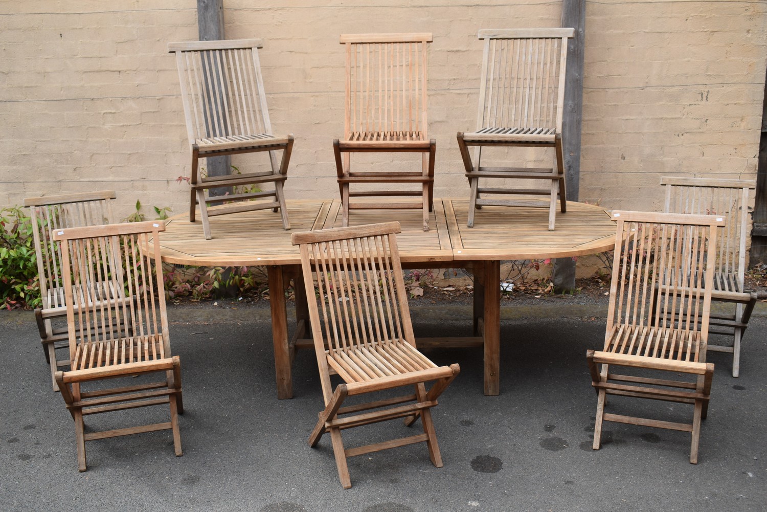 A NINE PIECE TEAK EXTENSION TABLE DINING SETTING (75H x 240W EXTENDED x UNEXTENDED x 120D CM) (PLEASE NOTE THIS HEAVY ITEM MUST BE REMOVED BY CARRIERS AT THE CUSTOMER'S EXPENSE. LEONARD JOEL STAFF CANNOT ASSIST CARRYING THIS ITEM) (X-LARGE ITEM)