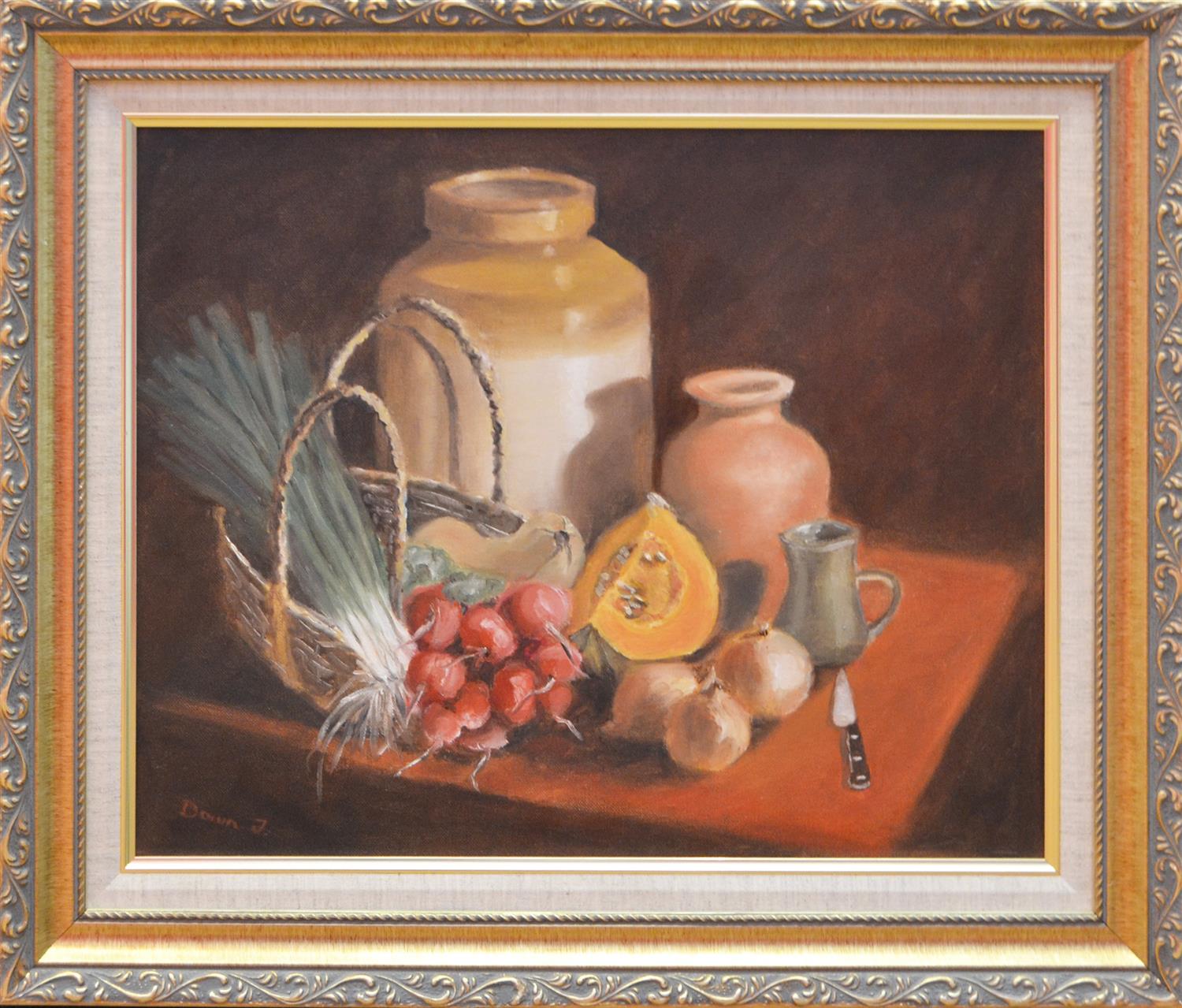 DAWN JONES, STILL LIFE WITH VEGETABLES, OIL ON CANVASBOARD, 39 X 49CM