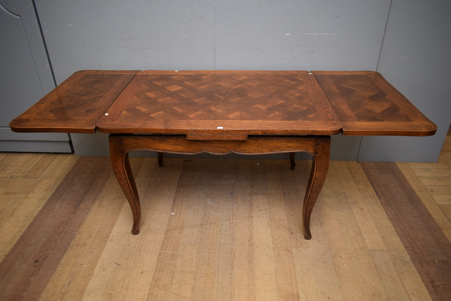AN OAK EXTENSION DINING TABLE WITH PARQUETRY TOP (75H X 119W, EXTENDED 206W X 90D CM) (PLEASE NOTE THIS HEAVY ITEM MUST BE REMOVED BY CARRIERS AT THE CUSTOMER'S EXPENSE. LEONARD JOEL STAFF CANNOT ASSIST CARRYING THIS ITEM) (X-LARGE ITEM)