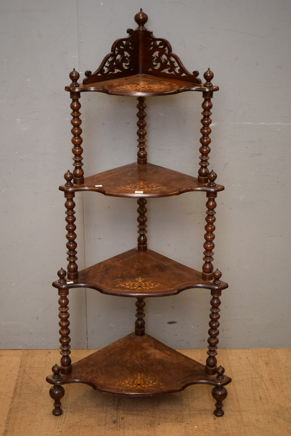 A DECORATIVELY CARVED AND TIMBER INLAID FOUR TIER WHATNOT WITH BARLEY TWIST (140H x 67W x 42D CM) (LEONARD JOEL DELIVERY SIZE: LARGE)