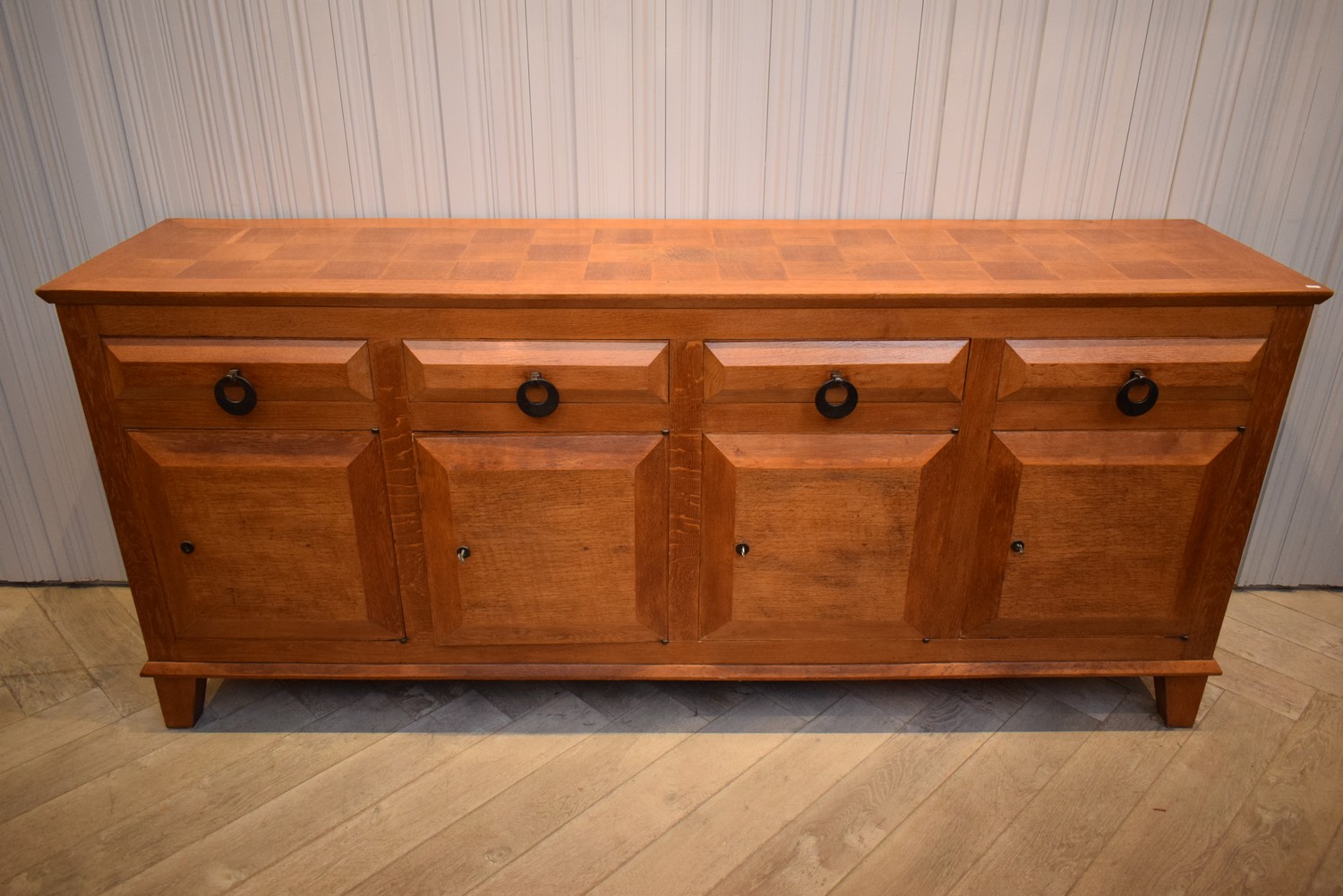 A SUBSTANTIAL OAK SIDEBOARD WITH PARQUETRY TOP (98H x 223W x 52D CM) (PLEASE NOTE THIS HEAVY ITEM MUST BE REMOVED BY CARRIERS AT THE CUSTOMER'S EXPENSE. LEONARD JOEL STAFF CANNOT ASSIST CARRYING THIS ITEM) (X-LARGE ITEM)