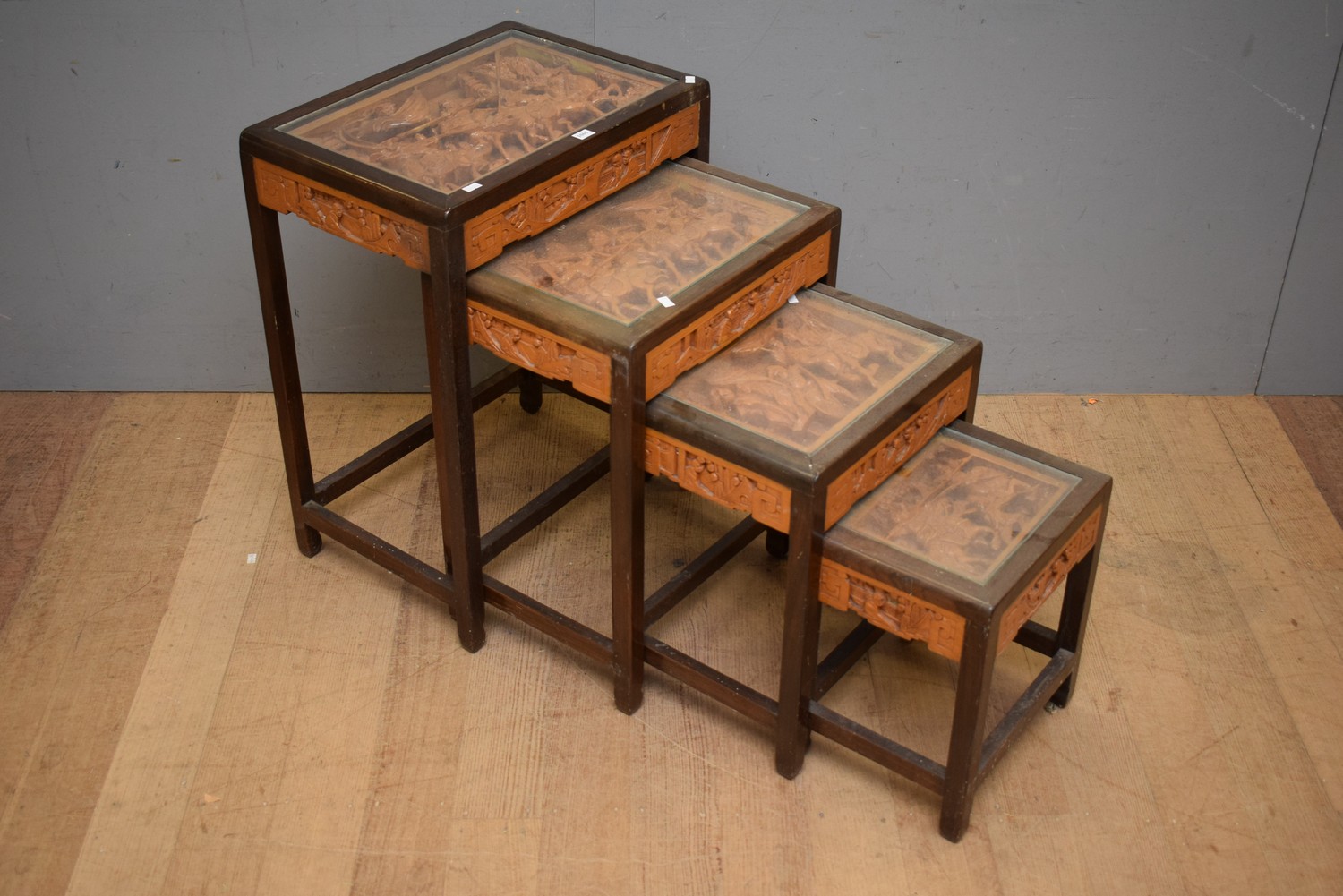A DECORATIVELY CARVED CHINESE NEST OF TABLES (A/F) (66H x 50W x 35D CM) (LEONARD JOEL DELIVERY SIZE: MEDIUM)