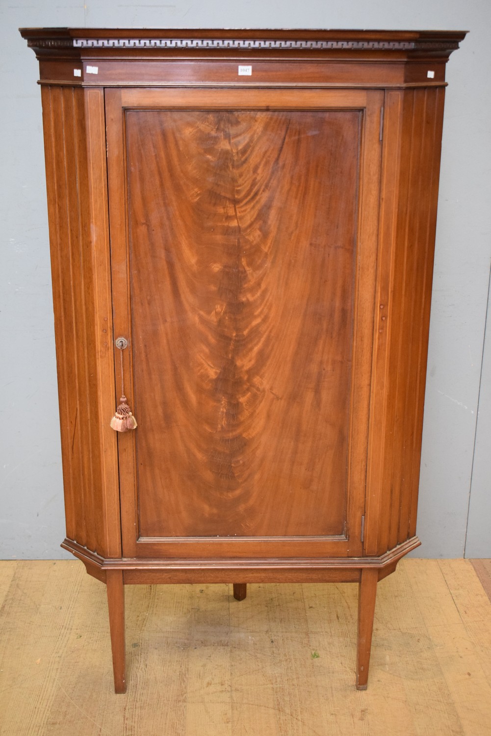 AN ANTIQUE FLAME MAHOGANY CORNER CABINET (154H x 92W x 58D CM) (LEONARD JOEL DELIVERY SIZE: LARGE)