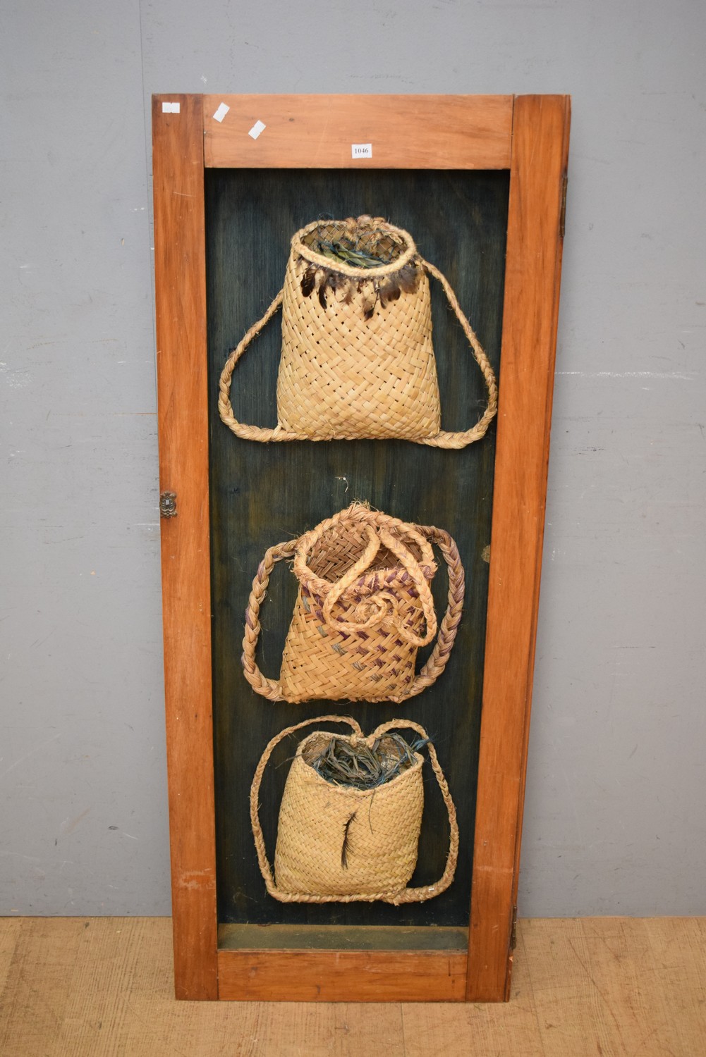 THREE BASKETS (KETE) IN A TIMBER FRAME, MADE IN NEW ZEALAND (140H x 54W x 15D CM) (LEONARD JOEL DELIVERY SIZE: MEDIUM)