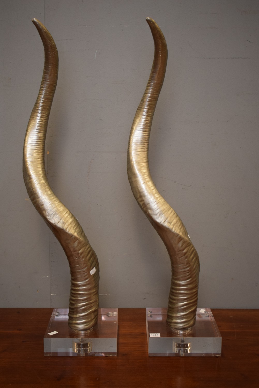 A PAIR OF SILVER LEAF TUSKS ON PERSPEX BASES (80H CM) (LEONARD JOEL DELIVERY SIZE: MEDIUM)