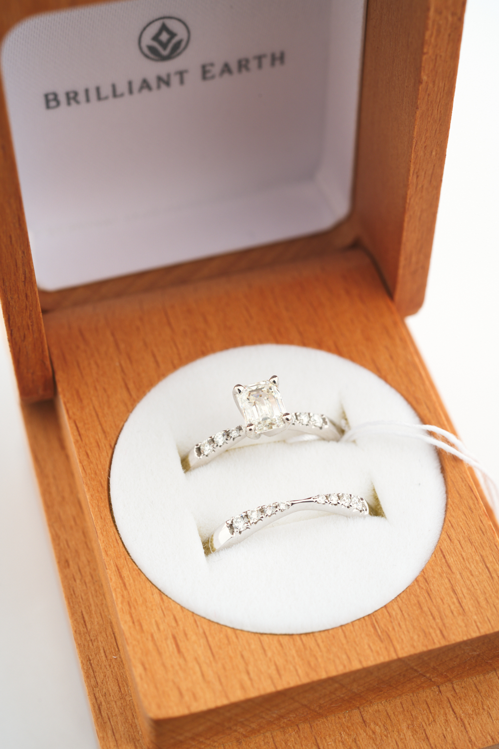 A DIAMOND RING SUITE BY BRILLIANT EARTH, CENTRALLY SET WITH AN EMERALD CUT DIAMOND OF 0.91CT, WITH FITTED DIAMOND SET WEDDER, IN 18CT WHITE GOLD, RING SIZE N-O, TOTAL WEIGHT 6.4GMS, WITH ACCOMPANYING GIA REPORT NUMBER 1225479905 STATING COLOUR I, CLARITY VVS2