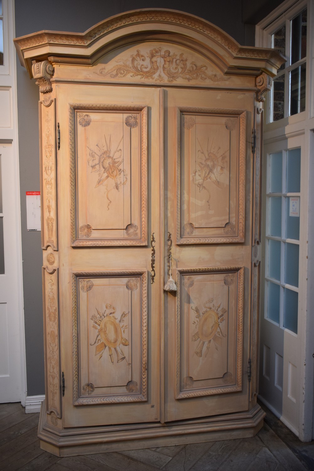 A LARGE ARMOIRE WITH FATIGUED ROCOCCO PAINTED FLOURISHES AND INTERIOR DRAWERS (A/F) (H283 X W180 X D83 CM) (PLEASE NOTE THIS HEAVY ITEM MUST BE REMOVED BY CARRIERS AT THE CUSTOMER'S EXPENSE. LEONARD JOEL STAFF CANNOT ASSIST CARRYING THIS ITEM) (X-LARGE ITEM)