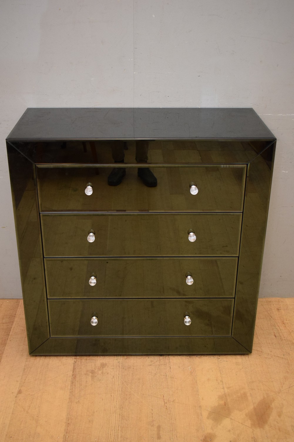 A BLACK HIGH GLOSS CHEST OF DRAWERS (A/F) CRACK TO GLASS) ( 102H X 100W X 46D CM) (PLEASE NOTE THIS HEAVY ITEM MUST BE REMOVED BY CARRIERS AT THE CUSTOMER'S EXPENSE. LEONARD JOEL STAFF CANNOT ASSIST CARRYING THIS ITEM) (X-LARGE ITEM)