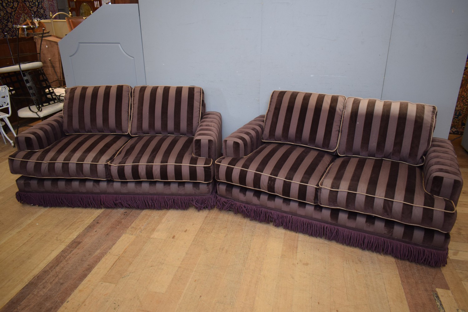 A PAIR OF VELVET STRIPED TWO SEATER SOFAS (A/F) ( 90H X 170W X 96D CM) (PLEASE NOTE THIS HEAVY ITEM MUST BE REMOVED BY CARRIERS AT THE CUSTOMER'S EXPENSE. LEONARD JOEL STAFF CANNOT ASSIST CARRYING THIS ITEM) (X-LARGE ITEM)