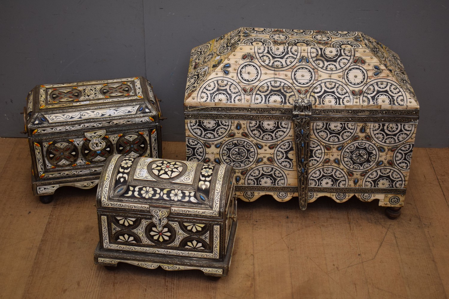 THREE BONE INLAID BOXES (A/F) (H55 X W67 X D37 CM) (LEONARD JOEL DELIVERY SIZE: LARGE)