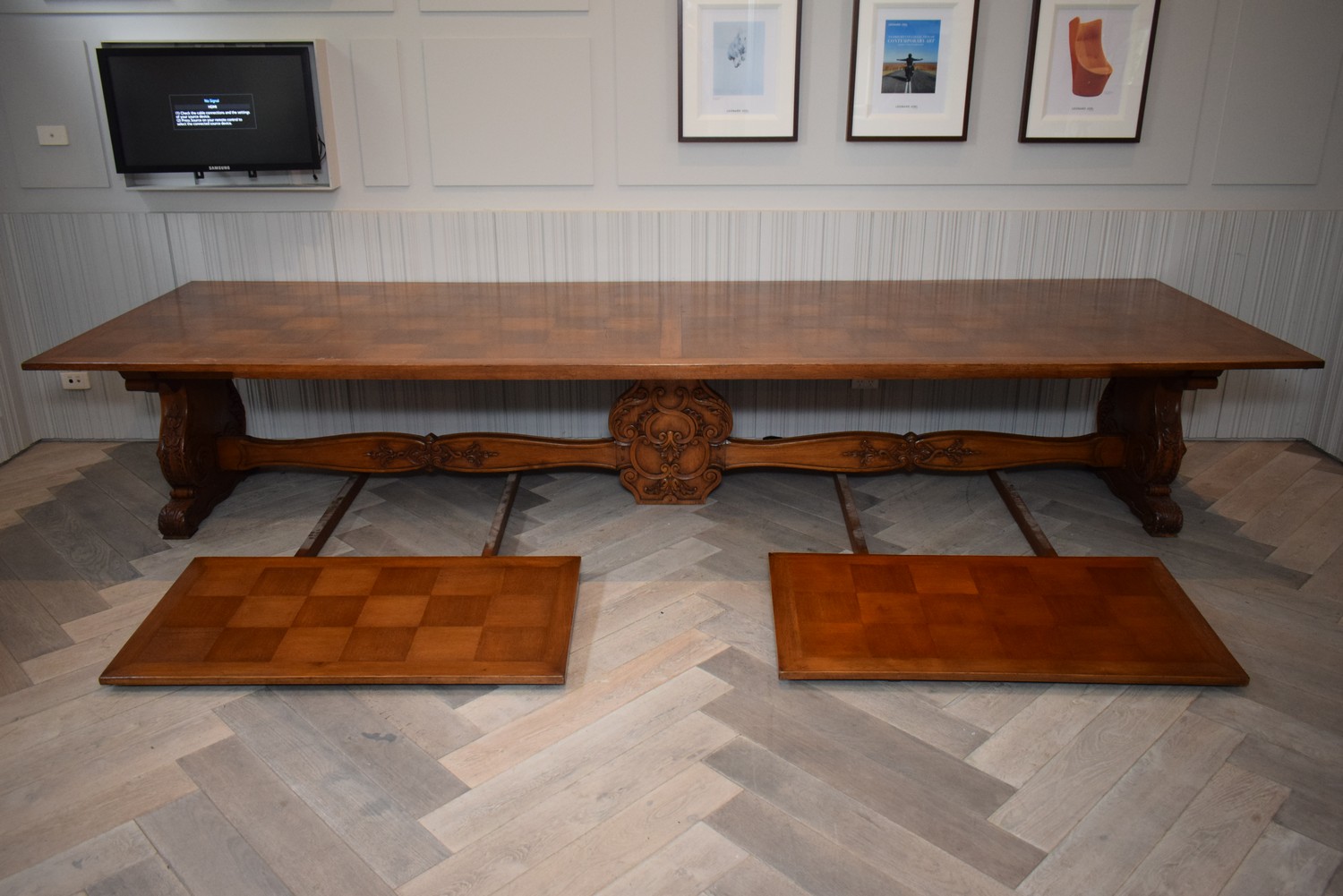 A FRENCH PROVINCIAL STYLE BANQUET TABLE WITH PARQUETRY TOP (A/F) (72H x 400W x 125D CM)UNEXTENDED. 530cm LENGTH EXTENDED.(THIS SUBSTANTIALLY HEAVY ITEM MUST BE REMOVED BY CARRIERS AT THE CUSTOMER'S EXPENSE. LEONARD JOEL STAFF CANNOT ASSIST CARRYING THIS ITEM) (X-LARGE ITEM)