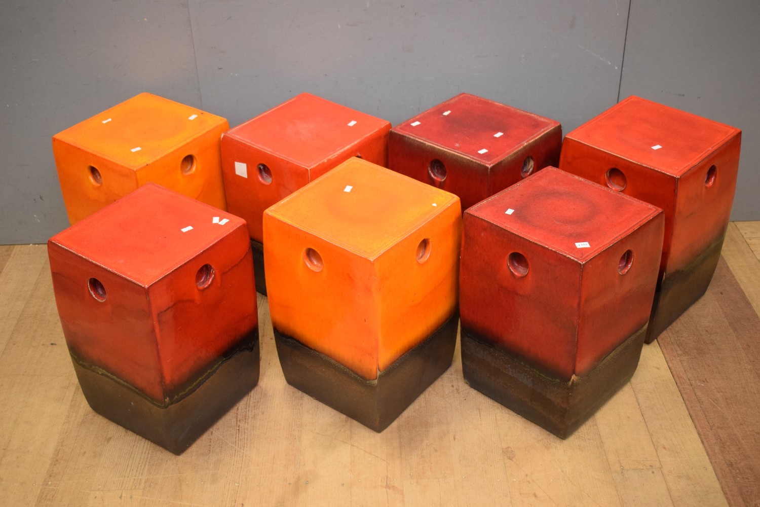 A COLLECTION OF SEVEN COLOURED CERAMIC OUTDOOR SIDE TABLES (H47 X W31 X D31 CM) (PLEASE NOTE THIS HEAVY ITEM MUST BE REMOVED BY CARRIERS AT THE CUSTOMER'S EXPENSE. LEONARD JOEL STAFF CANNOT ASSIST CARRYING THIS ITEM) (X-LARGE ITEM)