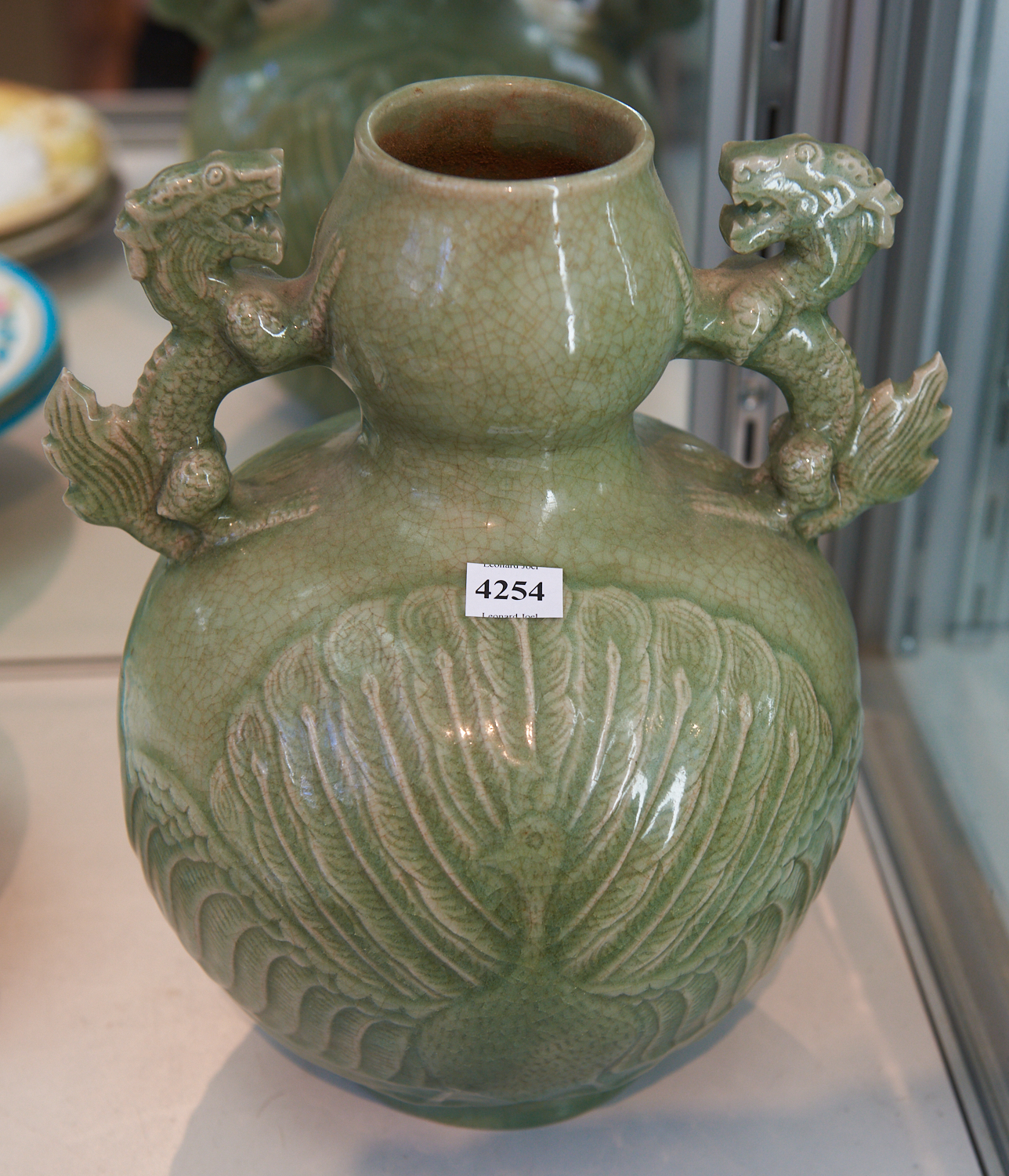 A CELADON CHINESE VASE WITH PHOENIX AND DRAGON DECORATION H.31CM, LEONARD JOEL LOCAL DELIVERY SIZE: SMALL