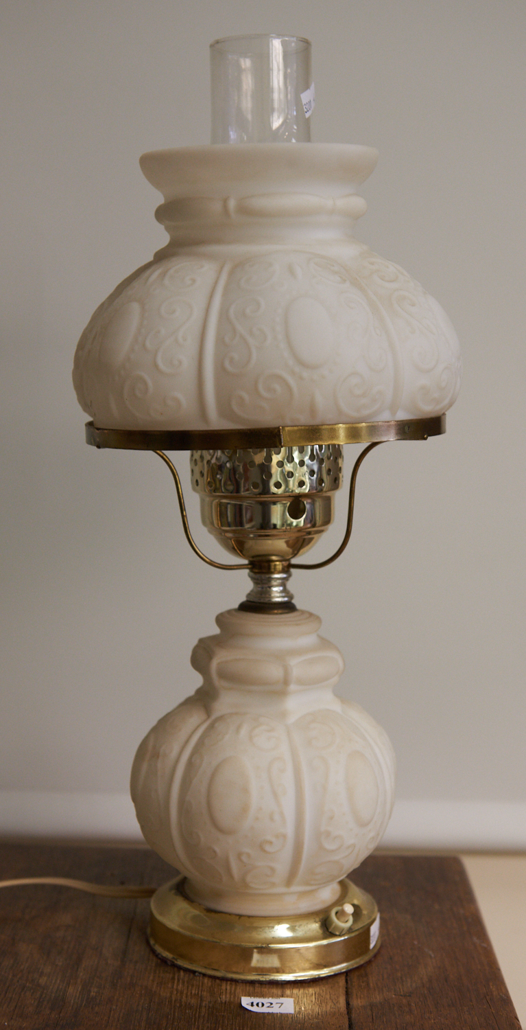 A MILK GLASS KEROSENE STYLE ELECTRIC LAMP H.46CM, LEONARD JOEL LOCAL DELIVERY SIZE: SMALL