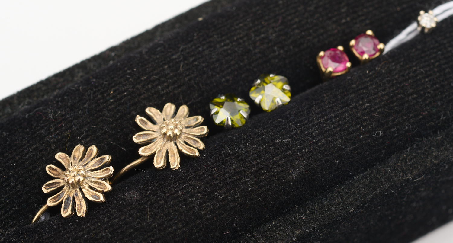 THREE PAIRS OF EARRINGS IN GOLD INCLUDING RUBY AND A SINGLE DIAMOND EARRING, A/F (NO BACKS)