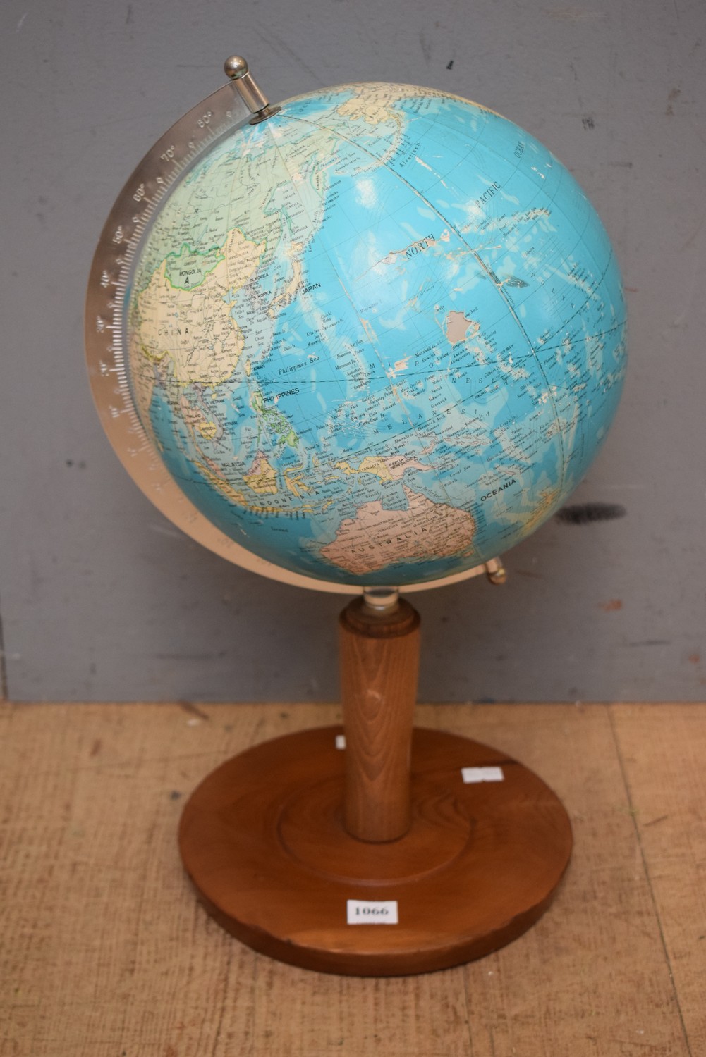 A WOODEN BASED WORLD GLOBE (A/F) (47H CM) (LEONARD JOEL DELIVERY SIZE: SMALL)