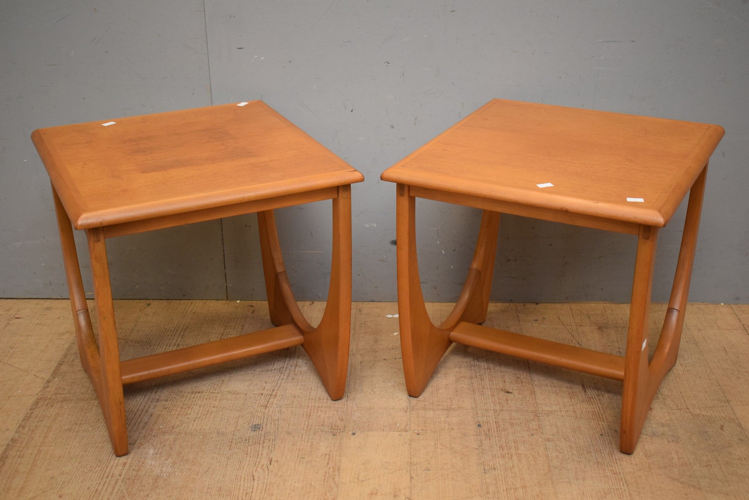 A PAIR OF 1960S RETRO G PLAN TEAK SIDE TABLES (44H X 45W X 42D CM) (LEONARD JOEL DELIVERY SIZE: MEDIUM)