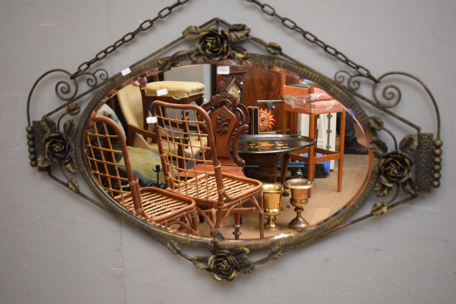 A 1920S FRENCH OVAL WROUGHT IRON ROSE ADORNED MIRROR WITH ORIGINAL HANGING CHAIN AND HOOK (66H X 102W CM) (LEONARD JOEL DELIVERY SIZE: LARGE)