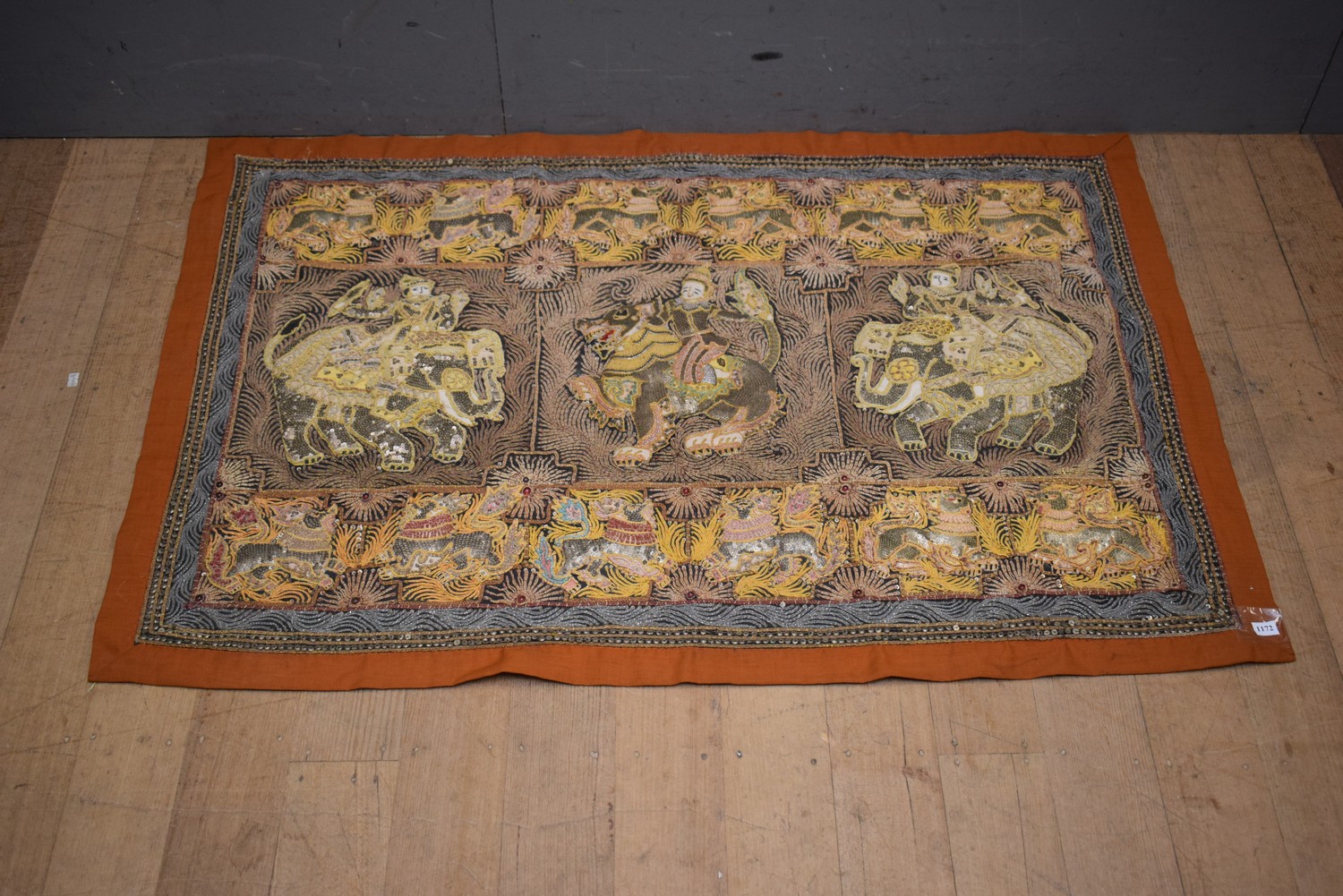 A INDIAN SILK EMBROIDERED AND SEQUEN ADORNED WALL HANGING (126 x 84 CM) (LEONARD JOEL DELIVERY SIZE: MEDIUM)