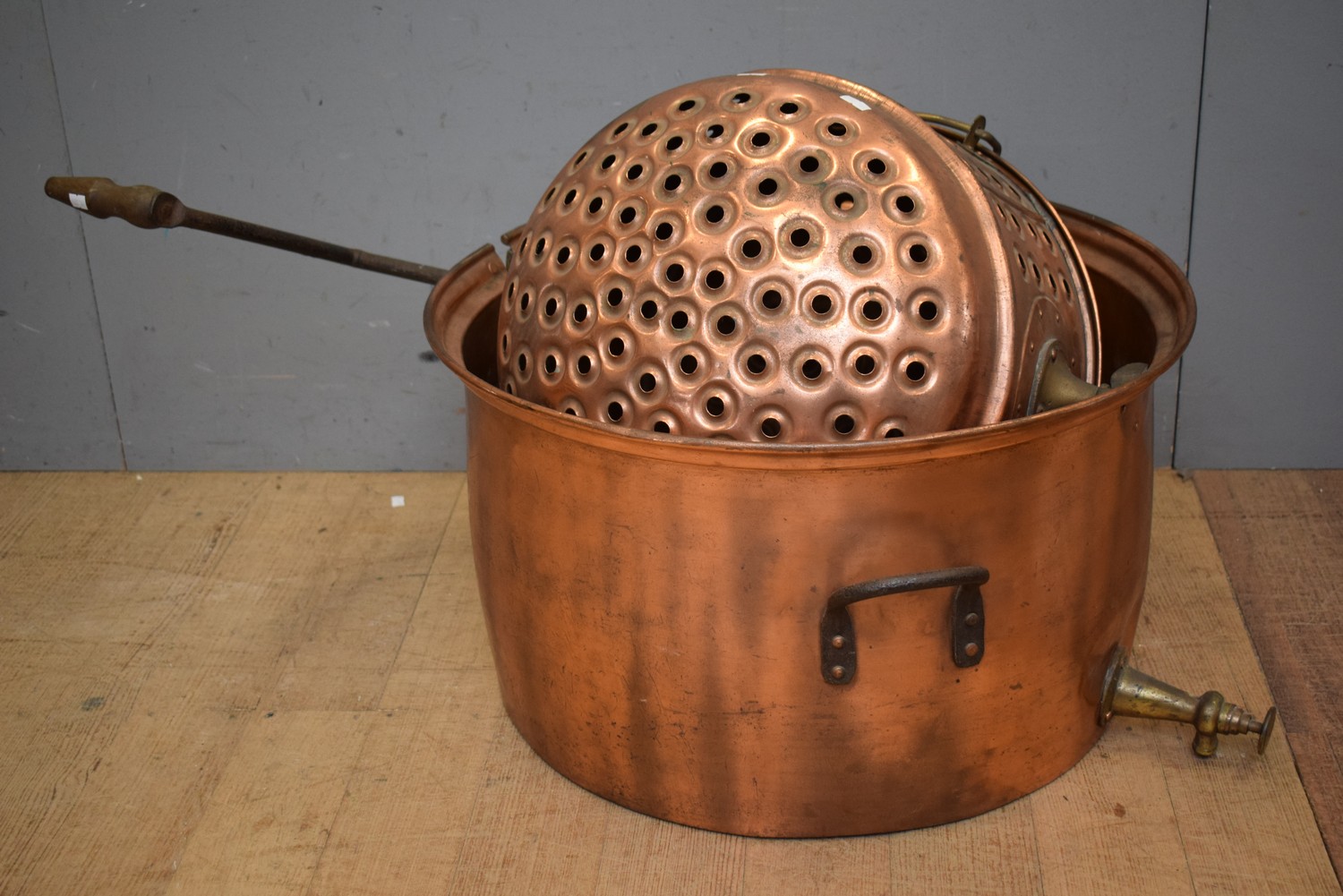 A LARGE 19TH CENTURY FRENCH COPPER WASHING TUB WITH ORIGINAL BRASS TAP AND STEEL AND WOODEN HANDLE (52H X 91W X 61D CM) (LEONARD JOEL DELIVERY SIZE: MEDIUM)