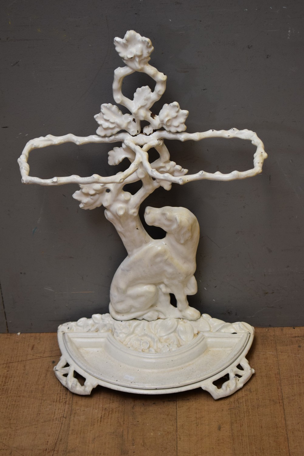 A 19TH CENTURY ENAMELLED FRENCH CAST IRON DOG FIGURAL UMBRELLA STAND, SIGNED N MARTIN (76H X 46W X 14D CM) (LEONARD JOEL DELIVERY SIZE: MEDIUM)
