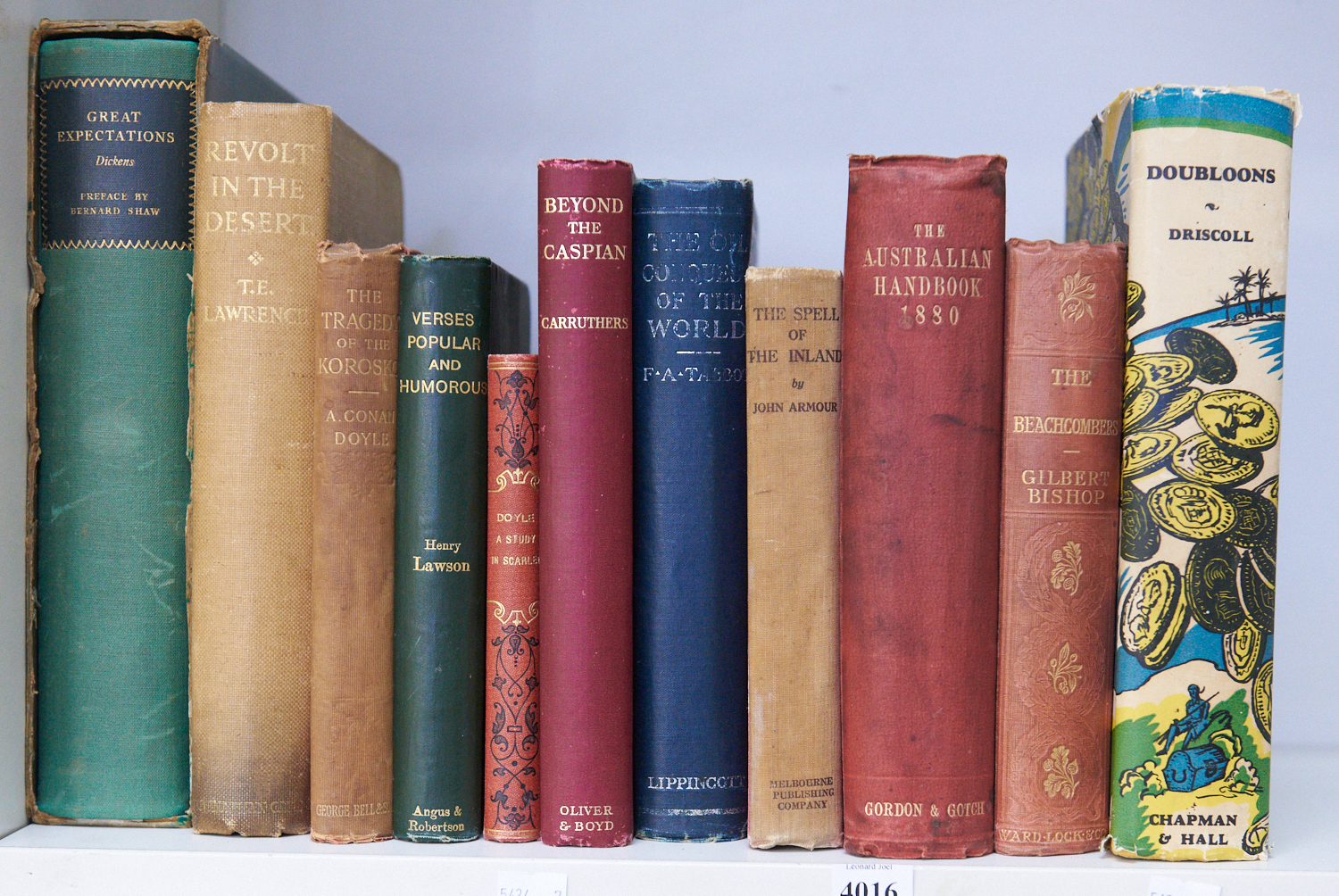 A SHELF OF ANTIQUARIAN BOOKS INCLUDING THE AUSTRALIAN HAND BOOK, LEONARD JOEL LOCAL DELIVERY SIZE: SMALL