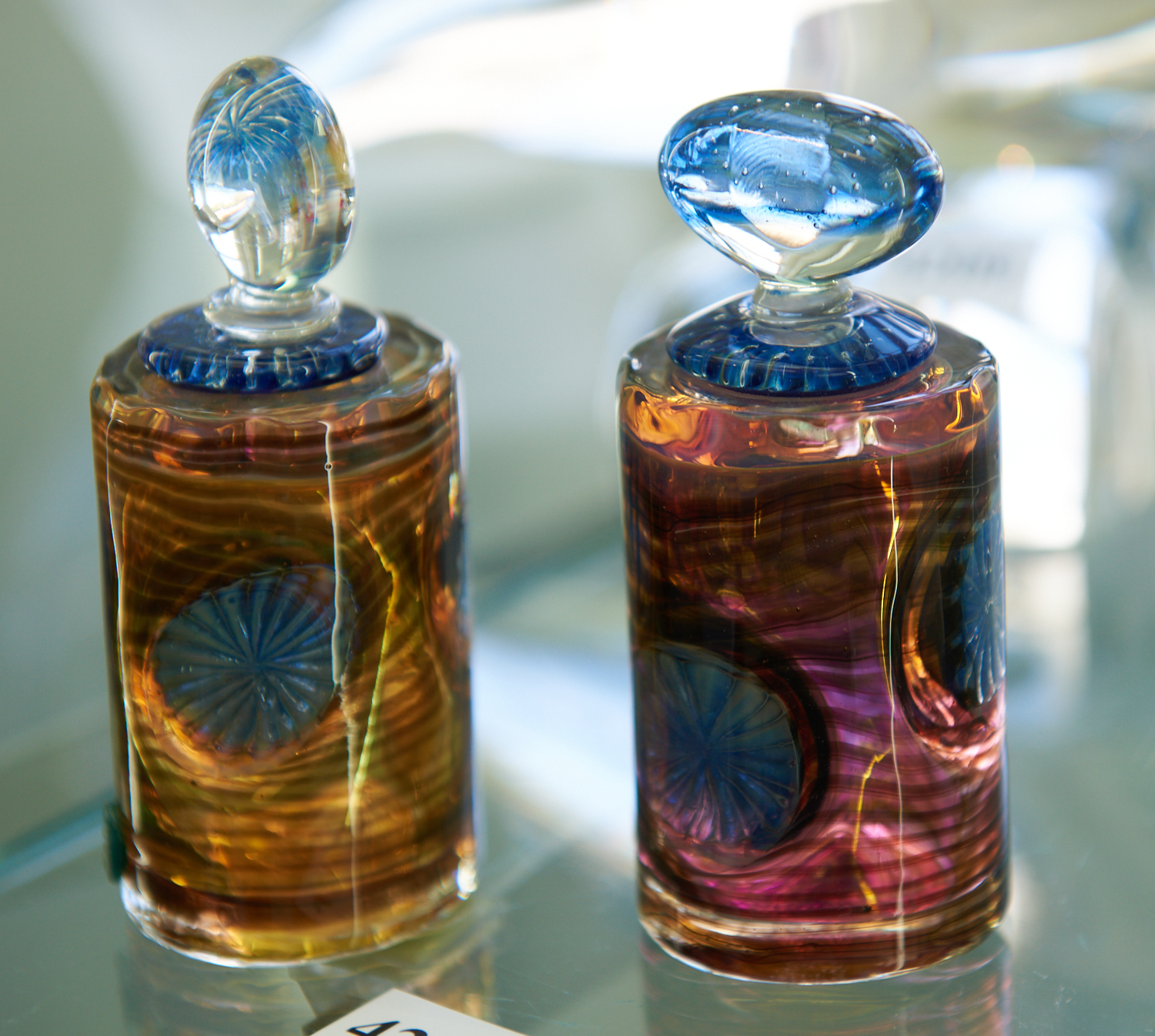 TWO RICHARD CLEMENTS ART GLASS PERFUME BOTTLES WITH STRIPED DECORATION H.9.8CM AND 9.5CM, LEONARD JOEL LOCAL DELIVERY SIZE: SMALL