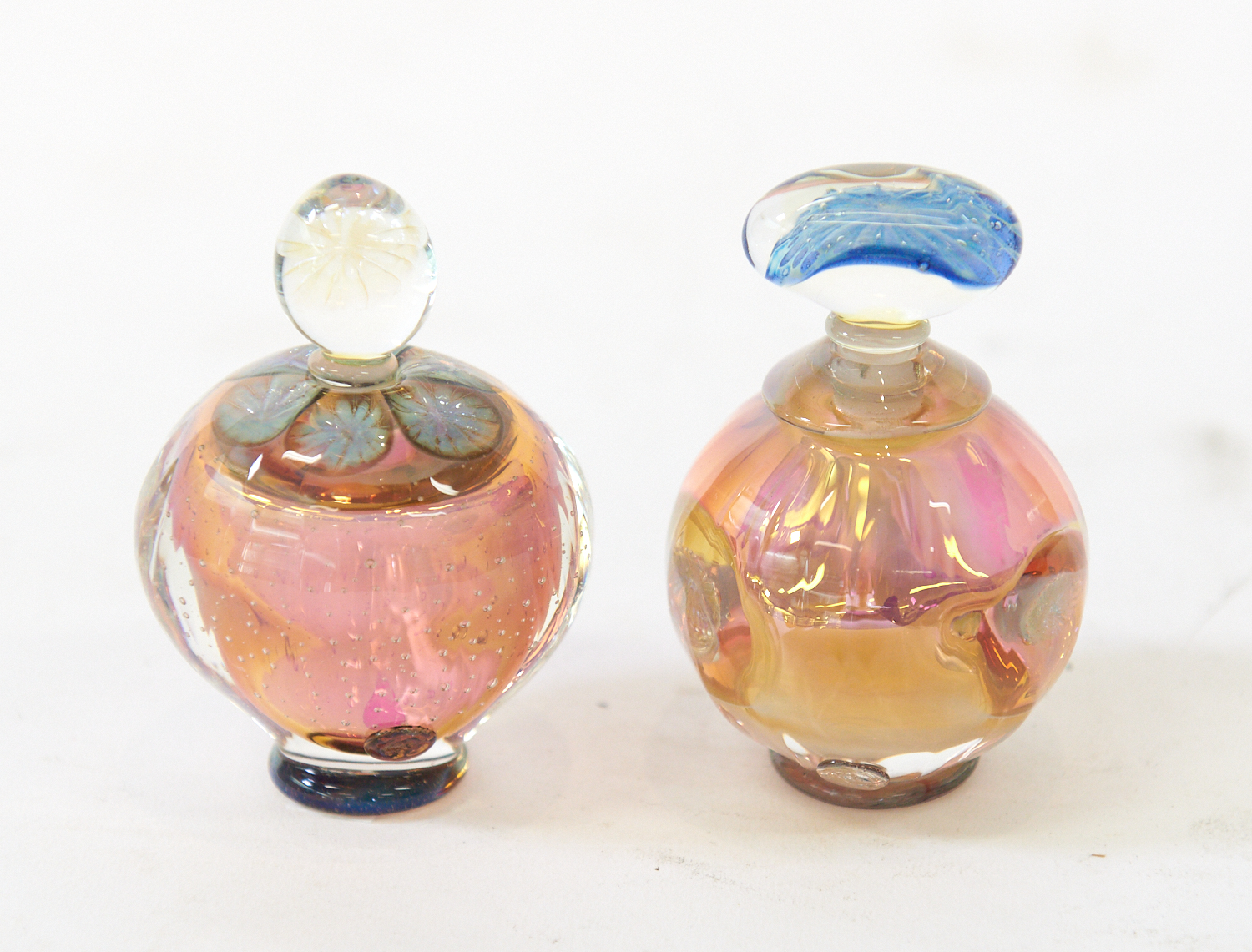 TWO RICHARD CLEMENTS ART GLASS PERFUME BOTTLES IN BLUE AND PINK TONES H.8.4CM EA, LEONARD JOEL LOCAL DELIVERY SIZE: SMALL