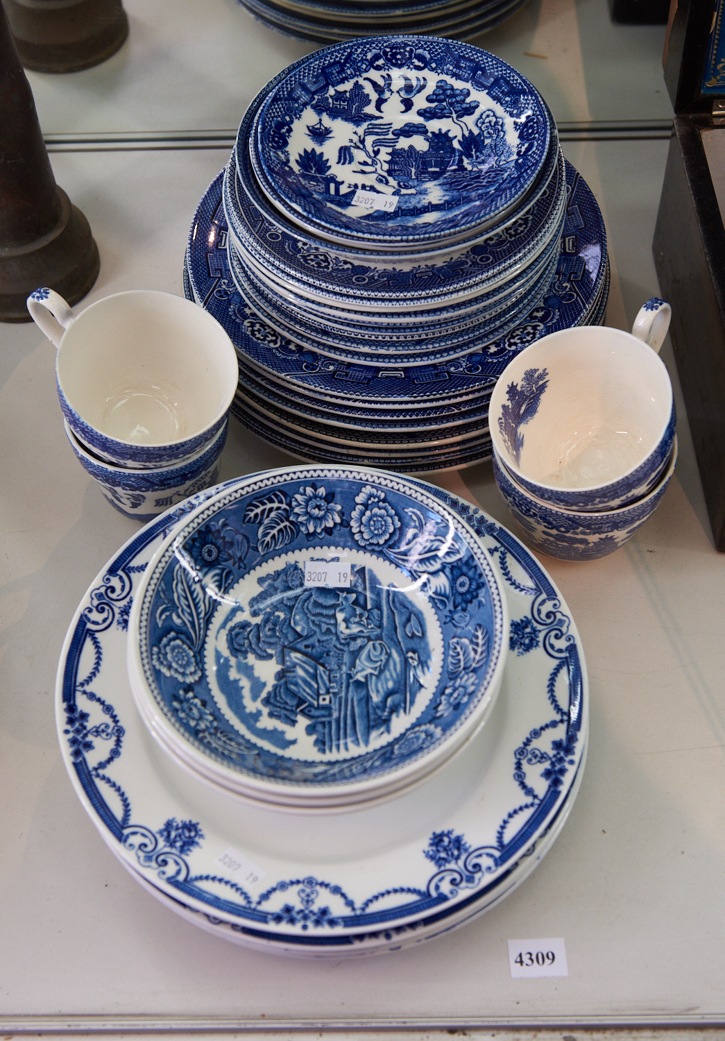 A LARGE COLLECTION OF WILLOW PATTERN AND WILLOW STYLE BLUE AND WHITE CHINA (A/F), LEONARD JOEL LOCAL DELIVERY SIZE: SMALL