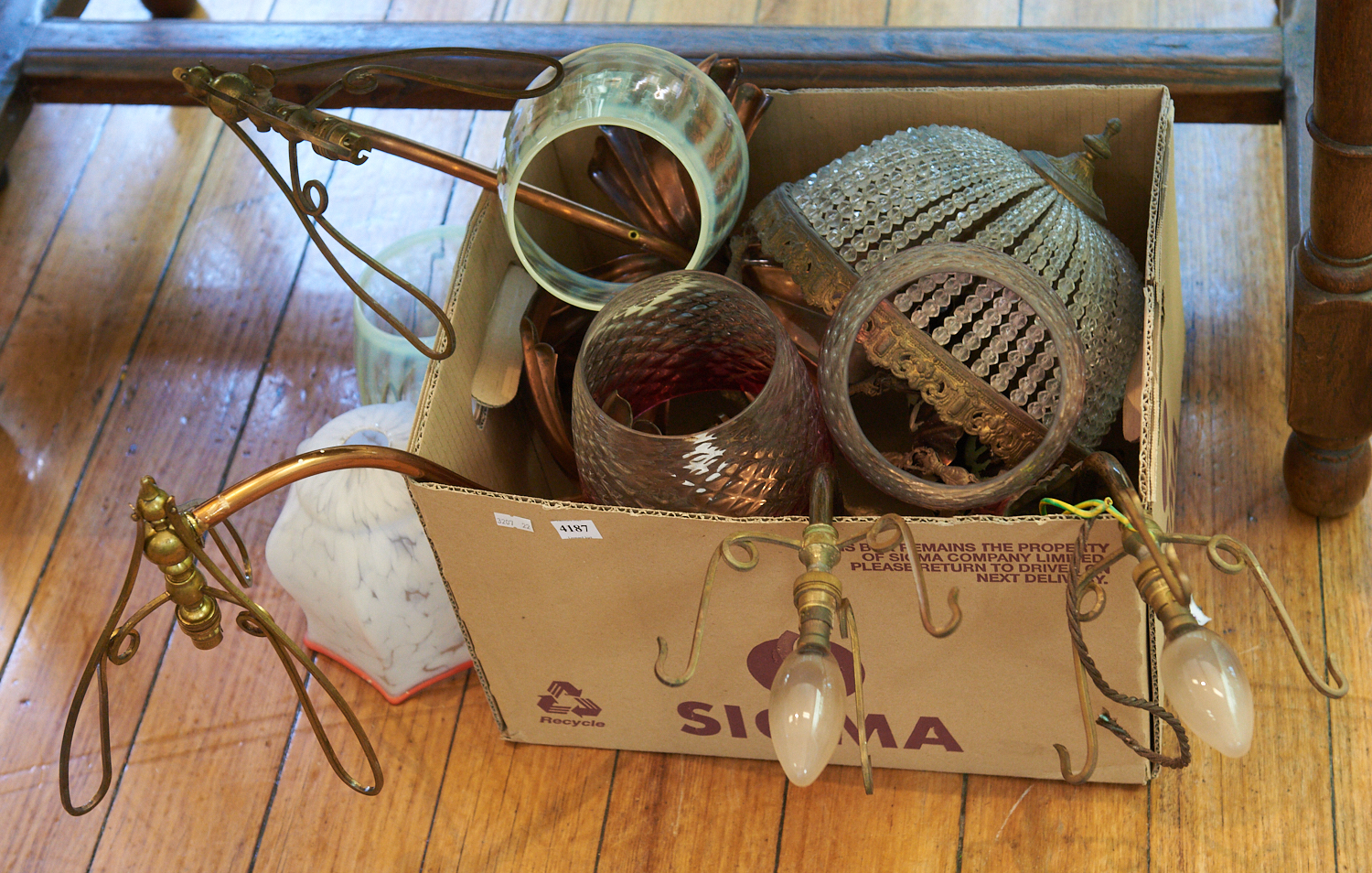 A BOX OF BRASS LAMPS AND LIGHT FITTINGS AND GLASS SHADES, LEONARD JOEL LOCAL DELIVERY SIZE: SMALL