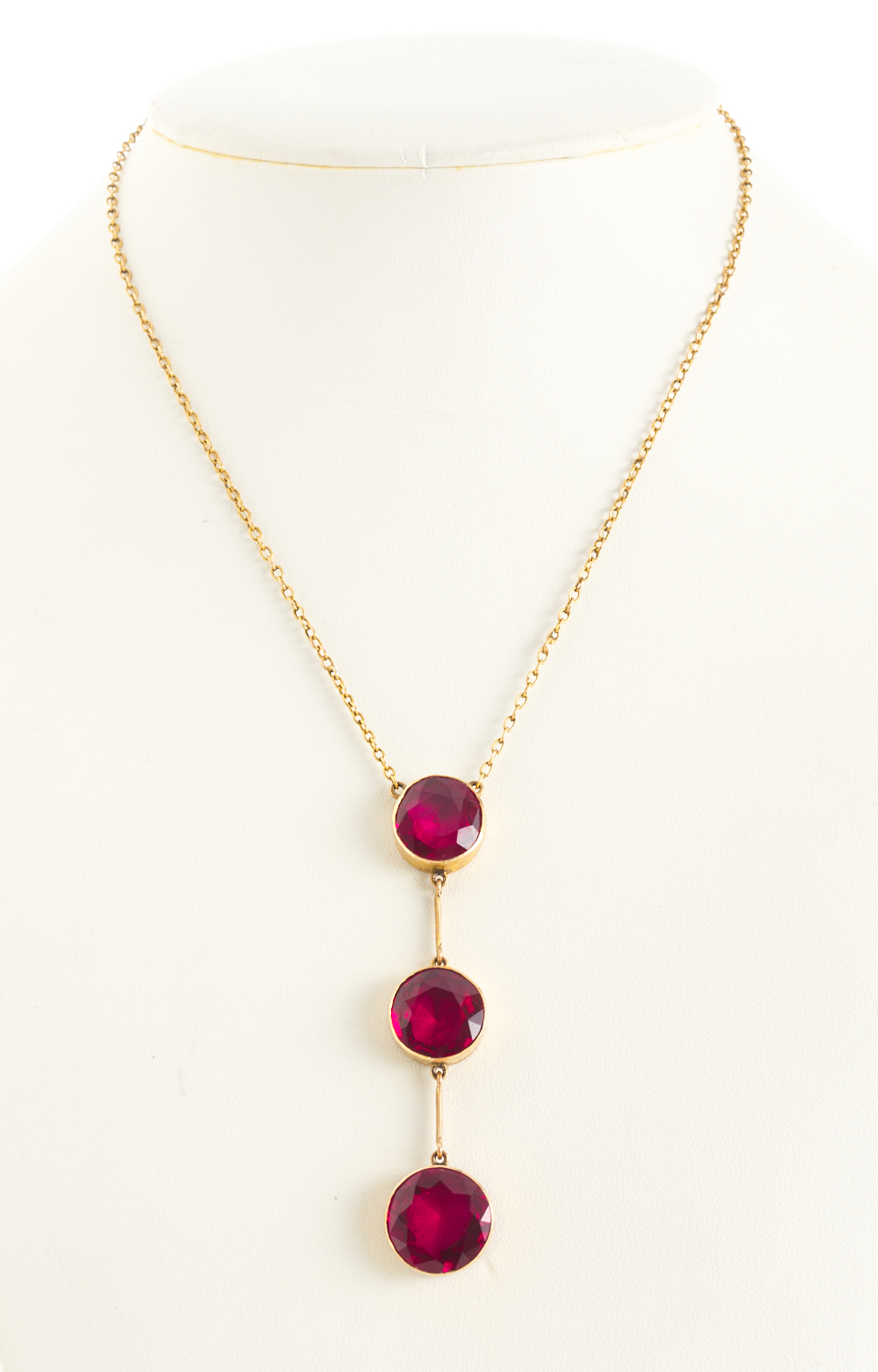 AN ANTIQUE RED PASTE SET DROP NECKLACE, IN 9CT GOLD, TOTAL LENGTH 380MM, 13.3GMS