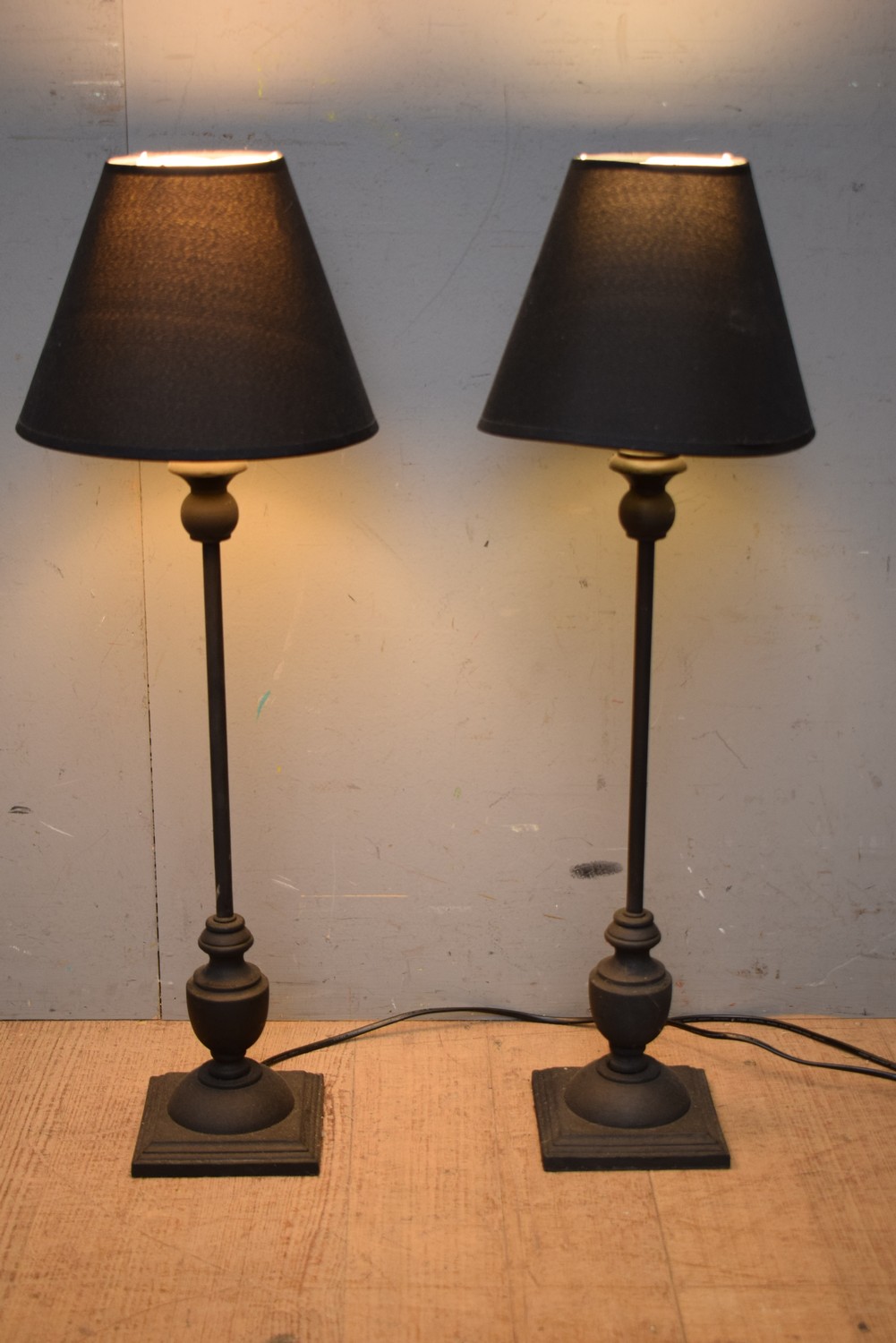 A PAIR OF METAL CLASSICAL STYLE TABLE LAMPS (A/F) (71H CM) (LEONARD JOEL DELIVERY SIZE: SMALL)