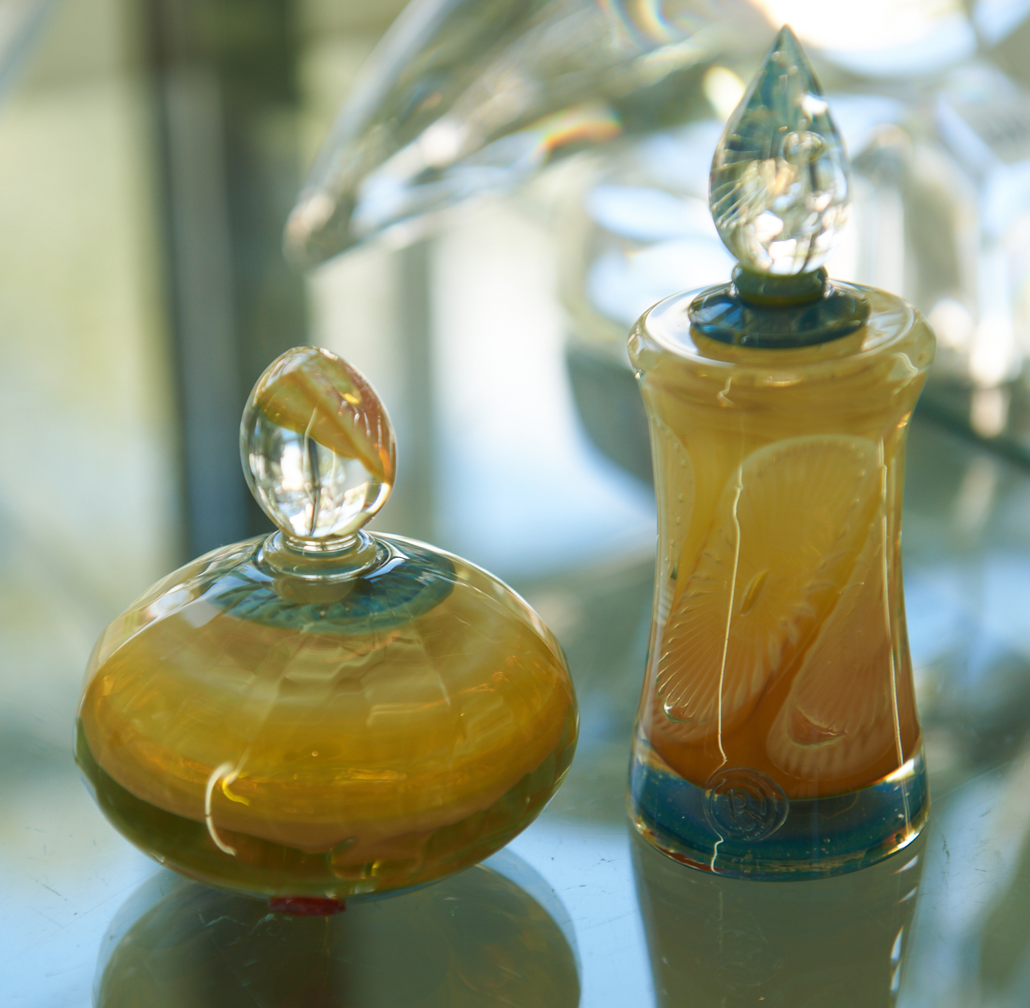 TWO RICHARD CLEMENTS ART GLASS PERFUME BOTTLES IN BLUE AND YELLOW TONES H.6.8CM AND 10.6CM, LEONARD JOEL LOCAL DELIVERY SIZE: SMALL